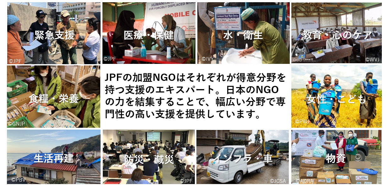 JPFは、NGO・経済界・政府など多様なセクターがつながり連携し支援を届けるプラットフォームとして、2000年に日本発の緊急人道支援のしくみとして誕生しました。それぞれ得意分野を持った45以上のNGO団体がJPFに加盟しており、被災地の状況や支援ニーズの把握を行い、緊急支援、医療・衛生、水食糧・生活用品物資の配給、教育・ケアなど、幅広い分野においての支援を行っています。