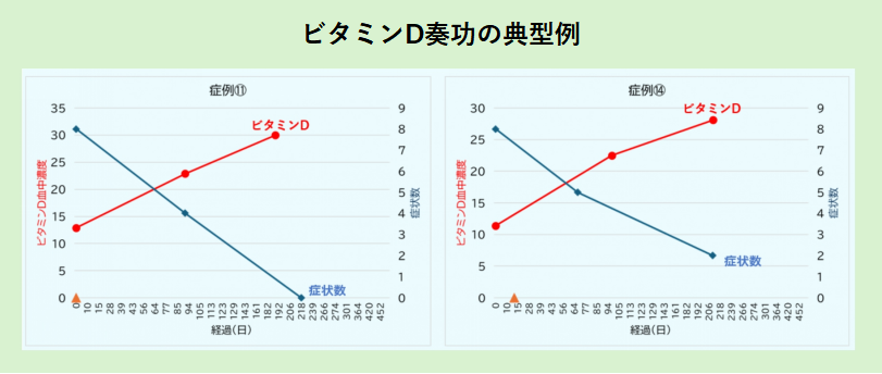 ME/CFSと診断された28人の患者さんに対して、血中ビタミンDを測定したところ、一例を除く全員に不足(30ng/mL未満20ng/mL以上)または欠乏(20ng/mL未満)していることが判明しました。そこでビタミンD補充療養指導を行った結果、血中ビタミンD値の上昇に伴ってME/CFSの診断基準と合致する症状数の減少が認められました。