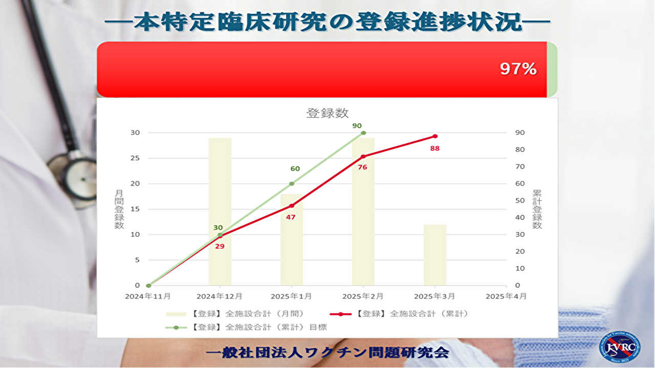 2025-03-21 22:00本特定臨床研究の登録進捗状況のご報告(2025年3月21日)本日時点の本臨床研究の症例登録進捗状況につきましては、目標の90例に対して現在88例が登録されており、登録目標の97%に達しております。2025年3月31日の症例登録期間終了まで残り10日となりました。登録状況につきましては、引き続きご報告いたします。2025-03-21 22:00本特定臨床研究の登録進捗状況のご報告(2025年3月21日)本日時点の本臨床研究の症例登録進捗状況につきましては、目標の90例に対して現在88例が登録されており、登録目標の97%に達しております。2025年3月31日の症例登録期間終了まで残り10日となりました。登録状況につきましては、引き続きご報告いたします。