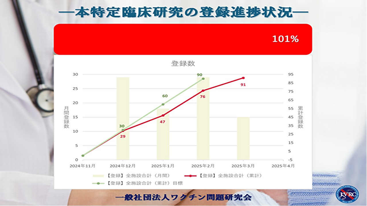 2025-04-01 18:30本特定臨床研究の最終登録数のご報告2025年3月31日をもちまして、本臨床研究の症例登録期間が終了いたしました。最終的な登録症例数は、目標の90例に対し、91例となりました。症例登録期間を3月31日まで1ヶ月間延長し、目標である症例登録数を達成することができました。2025-04-01 18:30本特定臨床研究の最終登録数のご報告2025年3月31日をもちまして、本臨床研究の症例登録期間が終了いたしました。最終的な登録症例数は、目標の90例に対し、91例となりました。症例登録期間を3月31日まで1ヶ月間延長し、目標である症例登録数を達成することができました。