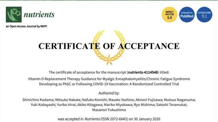 2026-02-11 10:00臨床研究終了後の英文論文発表のご報告本年2月3日、「新型コロナ感染後急性後遺症もしくはコロナワクチン接種後に発症した筋痛性脳脊髄炎・慢性疲労症候群の症例に対するビタミンD補充療養指導のランダム化比較試験」の成果を基に作成した英文論文を学術専門誌「 Nutrients 」に発表し、当該病態に対するビタミンD補充療養指導の有効性を世界で初めて学術論文として報告いたしました。2026-02-11 10:00臨床研究終了後の英文論文発表のご報告本年2月3日、「新型コロナ感染後急性後遺症もしくはコロナワクチン接種後に発症した筋痛性脳脊髄炎・慢性疲労症候群の症例に対するビタミンD補充療養指導のランダム化比較試験」の成果を基に作成した英文論文を学術専門誌「 Nutrients 」に発表し、当該病態に対するビタミンD補充療養指導の有効性を世界で初めて学術論文として報告いたしました。