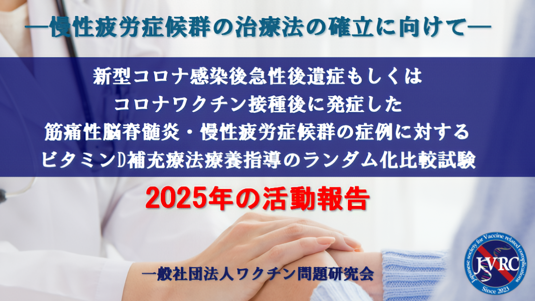 新型コロナ感染後急性後遺症もしくはコロナワクチン接種後に発症した筋痛性脳脊髄炎/慢性疲労症候群(ME/CFS)の症例に対する「ビタミンD補充療養指導のランダム化比較試験」は、2025年3月31日をもって症例登録期間が終了いたしました。