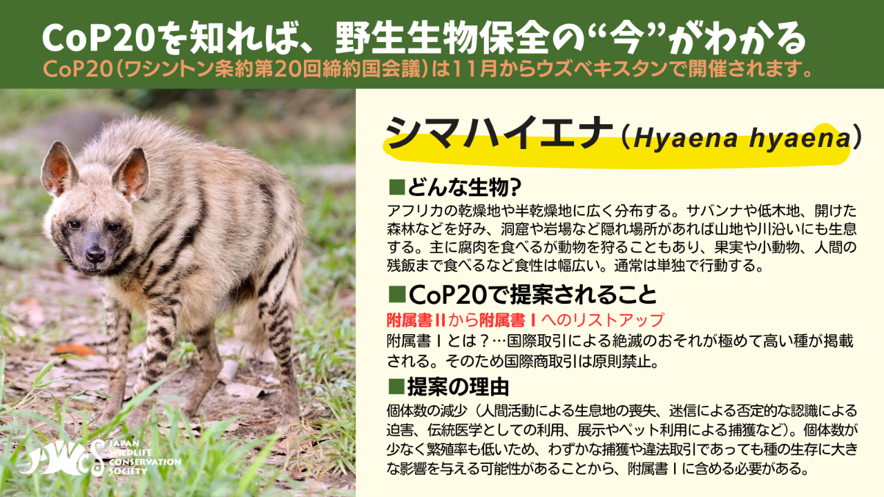 絶滅のおそれのある野生動植物種の国際取引を規制するワシントン条約の締約国会議に、日本のNGOとして参加するなど、日本の消費による世界の野生生物の絶滅の問題に取り組んでいます。