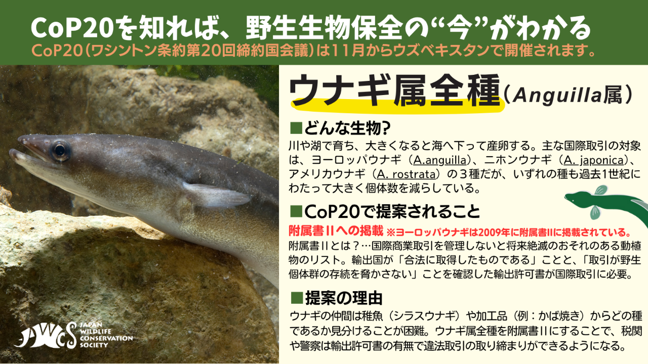 2025年11月24日~12月5日に、ワシントン条約(CITES)第20回締約国会議(CoP20)がウズベキスタンで開催されます。その議題として、ニホンウナギを含むウナギ属の附属書Ⅱ(国際取引に輸出許可書が必要)掲載を、EU、ホンジュラス、パナマが提案しています。ウナギを養殖するために、稚魚が河口で大量に捕獲され、高値で国際取引されるからです。ヨーロッパウナギはすでに附属書Ⅱに掲載されていますが、中国、台湾、韓国で稚魚が採捕されるニホンウナギ、カリブ地域からカナダ東岸で採捕されるアメリカウナギも乱獲が指摘されています。