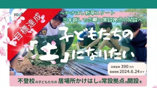 2024-06-20 16:55目標達成!本当にありがとうございます!!ご報告です!目標達成いたしました!! 目標を達成したことで手数料が免除され、いただいたご支援の多くを活動のために利用することができるようになりました。本当に本当にありがとうございます。 「こどもたちの未来のためにお役立てください」「かけはしの皆様、頑張ってください!」「いつも活動を拝見しています」あたたかいお気持ちと応援に感謝してもしきれません。 クラファン終了まであと4日✨応援よろしくお願いいたします。 最新情報は、SNSにてご覧いただけます。もじゃくん動画第二弾もございますので、是非ご覧ください! Facebook https://www.facebook.com/kakehashi.yokohama Instagram https://instagram.com/kakehashi.yokohama X https://twitter.com/Kakehashiyokoh12024-06-20 16:55目標達成!本当にありがとうございます!!ご報告です!目標達成いたしました!! 目標を達成したことで手数料が免除され、いただいたご支援の多くを活動のために利用することができるようになりました。本当に本当にありがとうございます。 「こどもたちの未来のためにお役立てください」「かけはしの皆様、頑張ってください!」「いつも活動を拝見しています」あたたかいお気持ちと応援に感謝してもしきれません。 クラファン終了まであと4日✨応援よろしくお願いいたします。 最新情報は、SNSにてご覧いただけます。もじゃくん動画第二弾もございますので、是非ご覧ください! Facebook https://www.facebook.com/kakehashi.yokohama Instagram https://instagram.com/kakehashi.yokohama X https://twitter.com/Kakehashiyokoh1