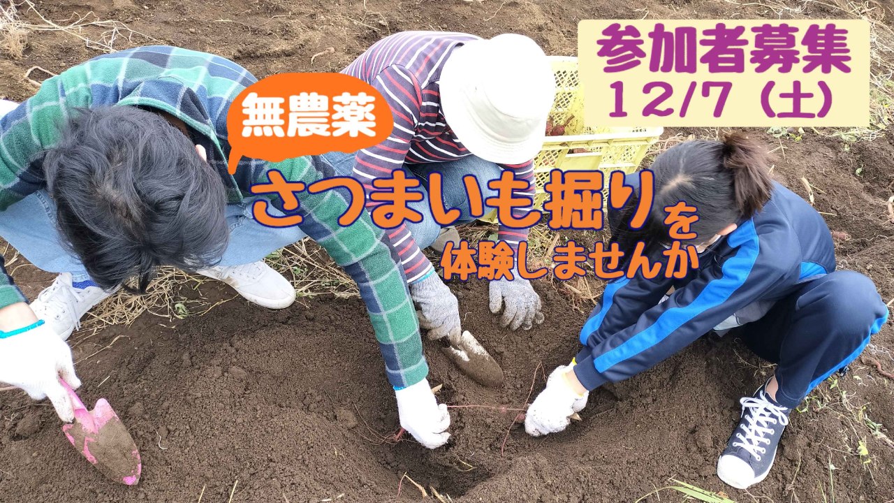 2024-11-28 08:59好評により第二弾**無農薬サツマイモ掘り体験イベントのお誘い**いつもかけはしの活動にご理解とご協力をありがとうございます。 かけはし畑よりお知らせいたします。 11月に実施しました【無農薬サツマイモ掘り体験】はのべ60名の方にご参加いただきました。 ご参加のみなさま、駆けつけていただき誠にありがとうございました。 この度、同じ内容で12/7(土)にも開催することにしました。 土に触れてリフレッシュしませんか。 ご検討をよろしくお願いいたします。2024-11-28 08:59好評により第二弾**無農薬サツマイモ掘り体験イベントのお誘い**いつもかけはしの活動にご理解とご協力をありがとうございます。 かけはし畑よりお知らせいたします。 11月に実施しました【無農薬サツマイモ掘り体験】はのべ60名の方にご参加いただきました。 ご参加のみなさま、駆けつけていただき誠にありがとうございました。 この度、同じ内容で12/7(土)にも開催することにしました。 土に触れてリフレッシュしませんか。 ご検討をよろしくお願いいたします。
