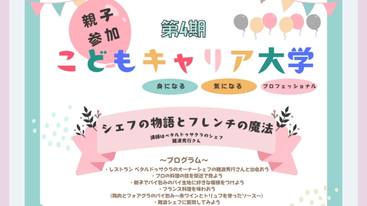 2024-11-06 08:30第4期こどもキャリア大学のお申し込みを開始しましたかけはしにお力添えいただいている皆様へ いつもかけはしの活動にご理解とご協力をありがとうございます。 「第4期こどもキャリア大学」のお申し込みを開始しましたので、お知らせします。 こどもたちと、プロフェッショナルで魅力的な大人との感動の「出会い」をつくりたい!またその人の「生き方」に触れたり、「体験」を通して、子どもたちが自分を見つめたり、自分の生き方を考えたりできる時間をつくりたい!と思い、3年前に開講しました。今年は4年目になります。 \こちらの講座は、外部のお子様もお申込みできます/ ※申し込み対象は小学2年生~中学3年生までのこどもと保護者 ぜひ講座の内容をご覧ください。2024-11-06 08:30第4期こどもキャリア大学のお申し込みを開始しましたかけはしにお力添えいただいている皆様へ いつもかけはしの活動にご理解とご協力をありがとうございます。 「第4期こどもキャリア大学」のお申し込みを開始しましたので、お知らせします。 こどもたちと、プロフェッショナルで魅力的な大人との感動の「出会い」をつくりたい!またその人の「生き方」に触れたり、「体験」を通して、子どもたちが自分を見つめたり、自分の生き方を考えたりできる時間をつくりたい!と思い、3年前に開講しました。今年は4年目になります。 \こちらの講座は、外部のお子様もお申込みできます/ ※申し込み対象は小学2年生~中学3年生までのこどもと保護者 ぜひ講座の内容をご覧ください。