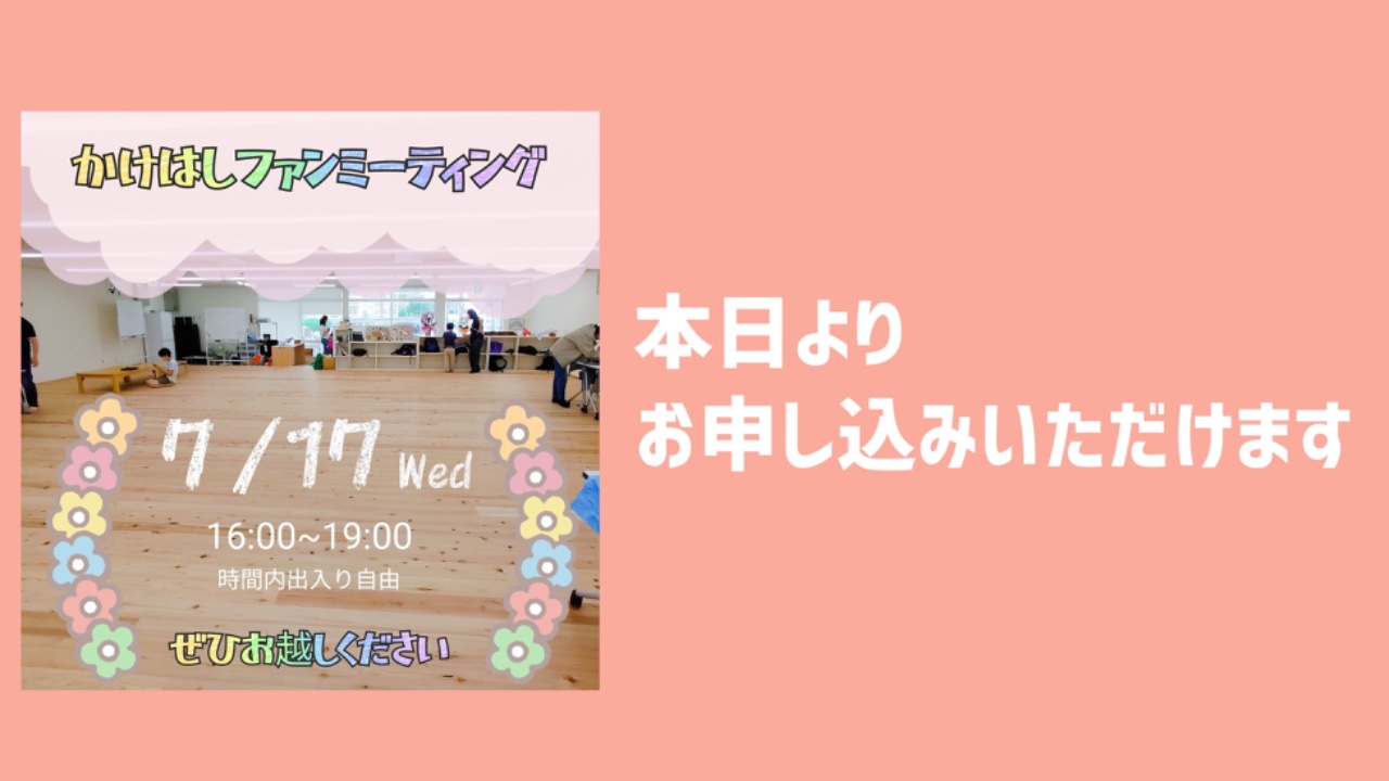 2024-06-29 22:07かけはしファンミーティングのご案内(今日からお申し込みいただけます)◆新しい居場所に遊びにいらっしゃいませんか◆ 7/17(水)16:00~19:00の間、新しく開設した居場所を自由にご覧いただけます。 クラファンでご支援くださったみなさま、ご寄付をくださった賛助会員のみなさま、講座やイベントにお力添えくださったみなさま、ボランティアをしてくださっていたみなさまなどなど、かけはしをいろいろな形で応援してくださったみなさまに、新しい拠点に遊びに来ていただき、みなさまの応援がどのような形でこどもたちに届いているのかを感じていただけたらという思い、そして感謝をお伝えしたいという思いで、開催します。 ぜひこの機会に足をお運びください✨ ご来場をご希望の方は、お申込フォームにご入力ください。 当日のキャンセルや、急なご参加も大丈夫です。 だいたいの人数把握のため、ご来場予定の方は、お申込みをいただけるとありがたいです。 お申込フォーム、内容はこちらから↓2024-06-29 22:07かけはしファンミーティングのご案内(今日からお申し込みいただけます)◆新しい居場所に遊びにいらっしゃいませんか◆ 7/17(水)16:00~19:00の間、新しく開設した居場所を自由にご覧いただけます。 クラファンでご支援くださったみなさま、ご寄付をくださった賛助会員のみなさま、講座やイベントにお力添えくださったみなさま、ボランティアをしてくださっていたみなさまなどなど、かけはしをいろいろな形で応援してくださったみなさまに、新しい拠点に遊びに来ていただき、みなさまの応援がどのような形でこどもたちに届いているのかを感じていただけたらという思い、そして感謝をお伝えしたいという思いで、開催します。 ぜひこの機会に足をお運びください✨ ご来場をご希望の方は、お申込フォームにご入力ください。 当日のキャンセルや、急なご参加も大丈夫です。 だいたいの人数把握のため、ご来場予定の方は、お申込みをいただけるとありがたいです。 お申込フォーム、内容はこちらから↓