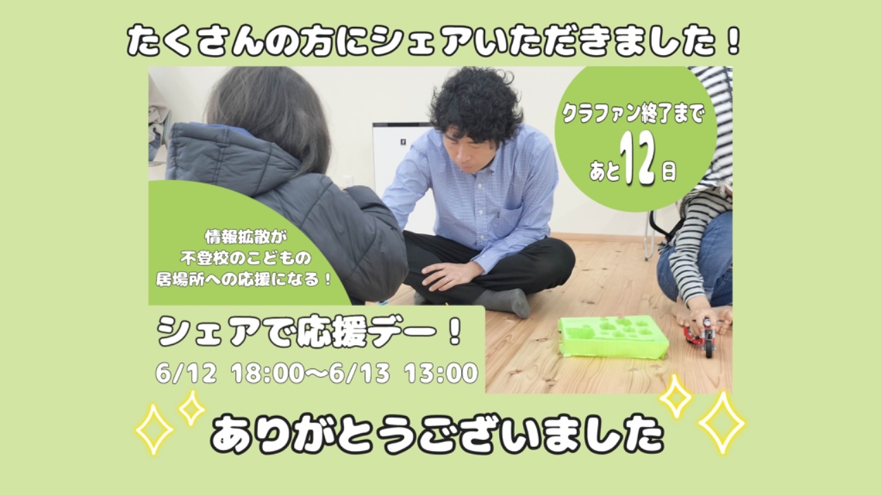 2024-06-13 20:31お力添えありがとうございました!「シェアで応援デー」サポーターのみなさまへ 昨日夕方より本日13:00まで「シェアで応援デー」にたくさんの方にご参加いただきありがとうございました。 昨日、今日のシェアをきっかけに新たにご支援くださった方がいらっしゃいました。ご支援してくださった方々からの心の温まるメッセージにとても励まされました。 本当にありがとうございます。 また、ぎっくり腰への心配の声もいただきました。お気遣いいただき、ありがとうございます。みなさまからの応援メッセージを力にかえて、なんとかぎっくり腰を早く治そうと奮闘中です。 明日もまた、こどもたちにとことん寄り添っていきます。 応援ありがとうございます!2024-06-13 20:31お力添えありがとうございました!「シェアで応援デー」サポーターのみなさまへ 昨日夕方より本日13:00まで「シェアで応援デー」にたくさんの方にご参加いただきありがとうございました。 昨日、今日のシェアをきっかけに新たにご支援くださった方がいらっしゃいました。ご支援してくださった方々からの心の温まるメッセージにとても励まされました。 本当にありがとうございます。 また、ぎっくり腰への心配の声もいただきました。お気遣いいただき、ありがとうございます。みなさまからの応援メッセージを力にかえて、なんとかぎっくり腰を早く治そうと奮闘中です。 明日もまた、こどもたちにとことん寄り添っていきます。 応援ありがとうございます!
