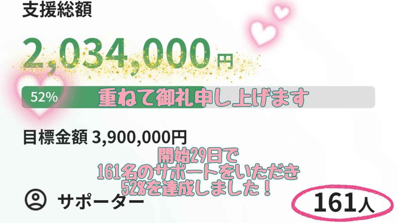 2024-06-12 20:44かけはしクラウドファンディング「シェアで応援デー」ご協力のお願いサポーターのみなさまへ 夜分に失礼いたします。 クラウドファンディングも残りあと12日となりました。 目標金額まで、あと残り1,354,000円(35%)です! お力添えいただきたいことがあり、メッセージ送らせていただきました。 本日、もじゃくんを中心に「クラファンご協力お願い動画」を作成しました♪ 急なお願いで恐縮ですが、SNSでなどで拡散していただけたら、大変ありがたいです。 本日6月12日(木)から翌6月13日(木)13:00までに、 こちらの動画をシェアしていただけたらと思います。よろしくお願いします! ↓↓↓2024-06-12 20:44かけはしクラウドファンディング「シェアで応援デー」ご協力のお願いサポーターのみなさまへ 夜分に失礼いたします。 クラウドファンディングも残りあと12日となりました。 目標金額まで、あと残り1,354,000円(35%)です! お力添えいただきたいことがあり、メッセージ送らせていただきました。 本日、もじゃくんを中心に「クラファンご協力お願い動画」を作成しました♪ 急なお願いで恐縮ですが、SNSでなどで拡散していただけたら、大変ありがたいです。 本日6月12日(木)から翌6月13日(木)13:00までに、 こちらの動画をシェアしていただけたらと思います。よろしくお願いします! ↓↓↓