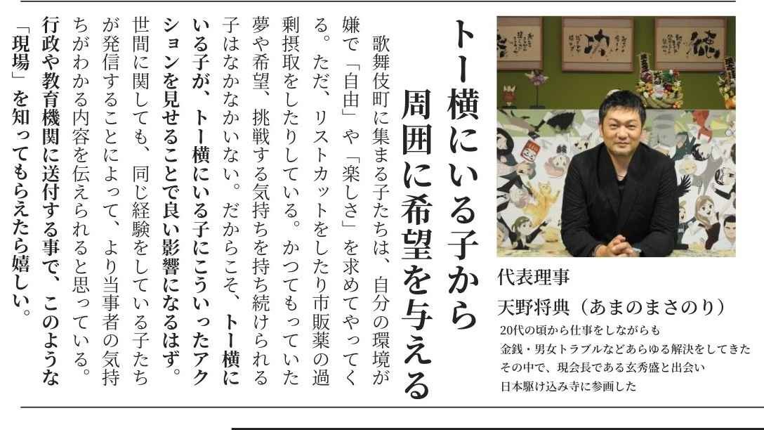 2024-03-18 10:56代表理事 天野からメッセージこのプロジェクトに関して、代表理事の天野からメッセージを頂きました! 歌舞伎町に集まる子たちは、自分の環境が嫌で「自由」や「楽しさ」を求めてやってくる。ただ、リストカットをしたり市販薬の過剰摂取をしたりしている。かつてもっていた夢や希望、挑戦する気持ちを持ち続けられる子はなかなかいない。だからこそ、トー横にいる子が、トー横にいる子にこういったアクションを見せることで良い影響になるはず。世間に関しても、同じ経験をしている子たちが発信することによって、より当事者の気持ちがわかる内容を伝えられると思っている。行政や教育機関に送付する事で、このような「現場」を知ってもらえたら嬉しい。2024-03-18 10:56代表理事 天野からメッセージこのプロジェクトに関して、代表理事の天野からメッセージを頂きました! 歌舞伎町に集まる子たちは、自分の環境が嫌で「自由」や「楽しさ」を求めてやってくる。ただ、リストカットをしたり市販薬の過剰摂取をしたりしている。かつてもっていた夢や希望、挑戦する気持ちを持ち続けられる子はなかなかいない。だからこそ、トー横にいる子が、トー横にいる子にこういったアクションを見せることで良い影響になるはず。世間に関しても、同じ経験をしている子たちが発信することによって、より当事者の気持ちがわかる内容を伝えられると思っている。行政や教育機関に送付する事で、このような「現場」を知ってもらえたら嬉しい。