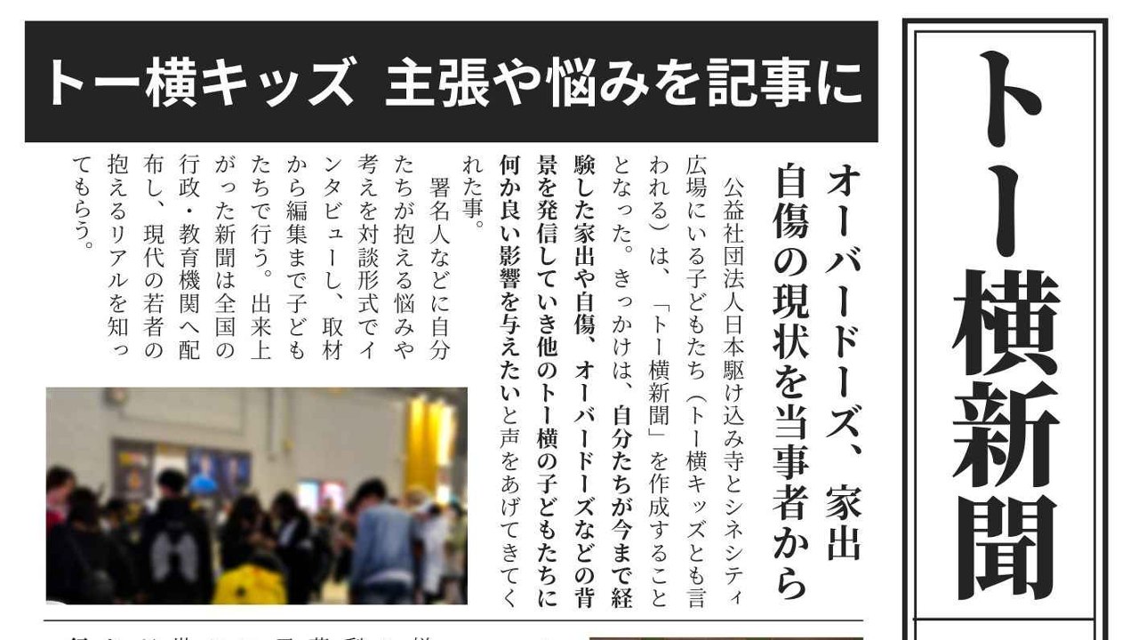 公益社団法人日本駆け込み寺は、子ども食堂「歌舞伎町みらいカフェ」での食事提供や歌舞伎町の清掃活動中の声かけなどで「トー横キッズ」たちを支援しています。世間やメディアでは、非難されているキッズたちですが「自分たちの力でアクションを起こしたい!」と立ち上がっている子ども達もいます。そういった子どもたちの”やりたい”ことの1つに、今の若者の悩みや非行、薬物についてなどを自分たちで発信したいという思いがありました。そこで当団体は、発信するための「トー横新聞」を子どもたちと作成することにしました。一緒に作成するといっても、アポ取りから取材、編集まですべて子どもたちが行い、そのサポートを当団体が行います。今回、この新聞を作成するための資金を募ることにしました。