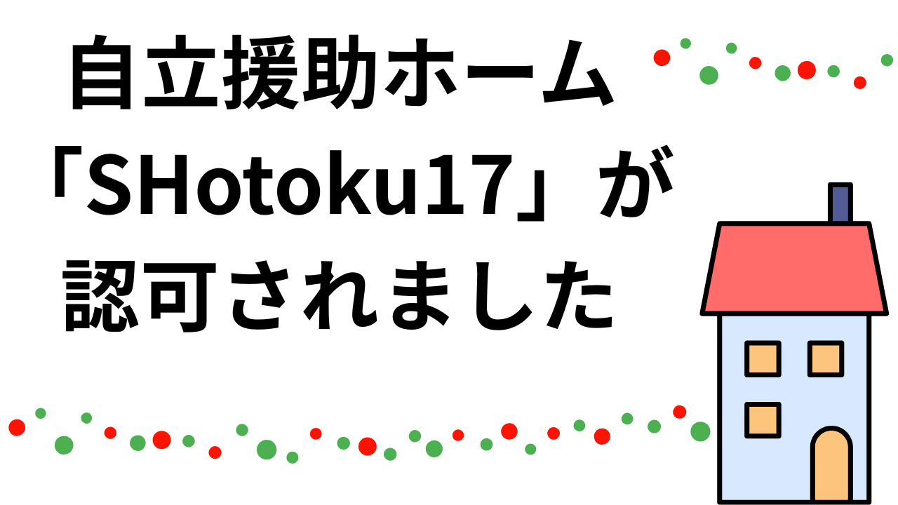 2025-12-05 17:07自立援助ホームが認可されました。皆さまからご支援いただいた自立援助ホームが認可を得ることができました。 施設名は「SHotoku17」です。 これから若者の居場所となれるように頑張って運営していきますので、これからも見守っていただけると幸いです。2025-12-05 17:07自立援助ホームが認可されました。皆さまからご支援いただいた自立援助ホームが認可を得ることができました。 施設名は「SHotoku17」です。 これから若者の居場所となれるように頑張って運営していきますので、これからも見守っていただけると幸いです。