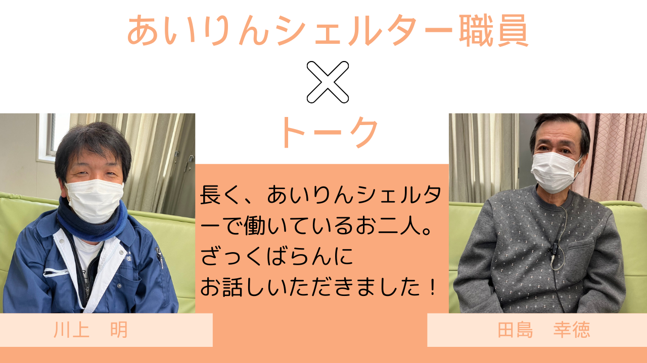 2024-12-22 11:00あいりんシェルター職員によるトーク!あいりんシェルターで長く働いていて、今はシェルターの管理業務もしている、田島幸徳と川上明。 お二人に、あいりんシェルターのことや今回のプロジェクトのことなどを、ざっくばらんにお話しいただきました!2024-12-22 11:00あいりんシェルター職員によるトーク!あいりんシェルターで長く働いていて、今はシェルターの管理業務もしている、田島幸徳と川上明。 お二人に、あいりんシェルターのことや今回のプロジェクトのことなどを、ざっくばらんにお話しいただきました!