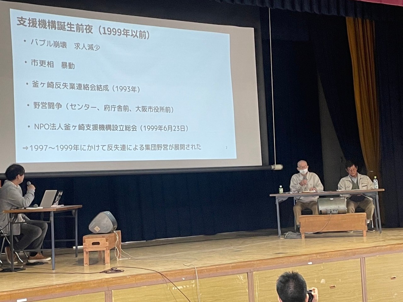 冒頭は「25年振り返りトーク」として釜ヶ崎支援機構がNPO法人として発足する以前から発足当初のことを、松繫逸夫さんと理事長からお話しいただきました。