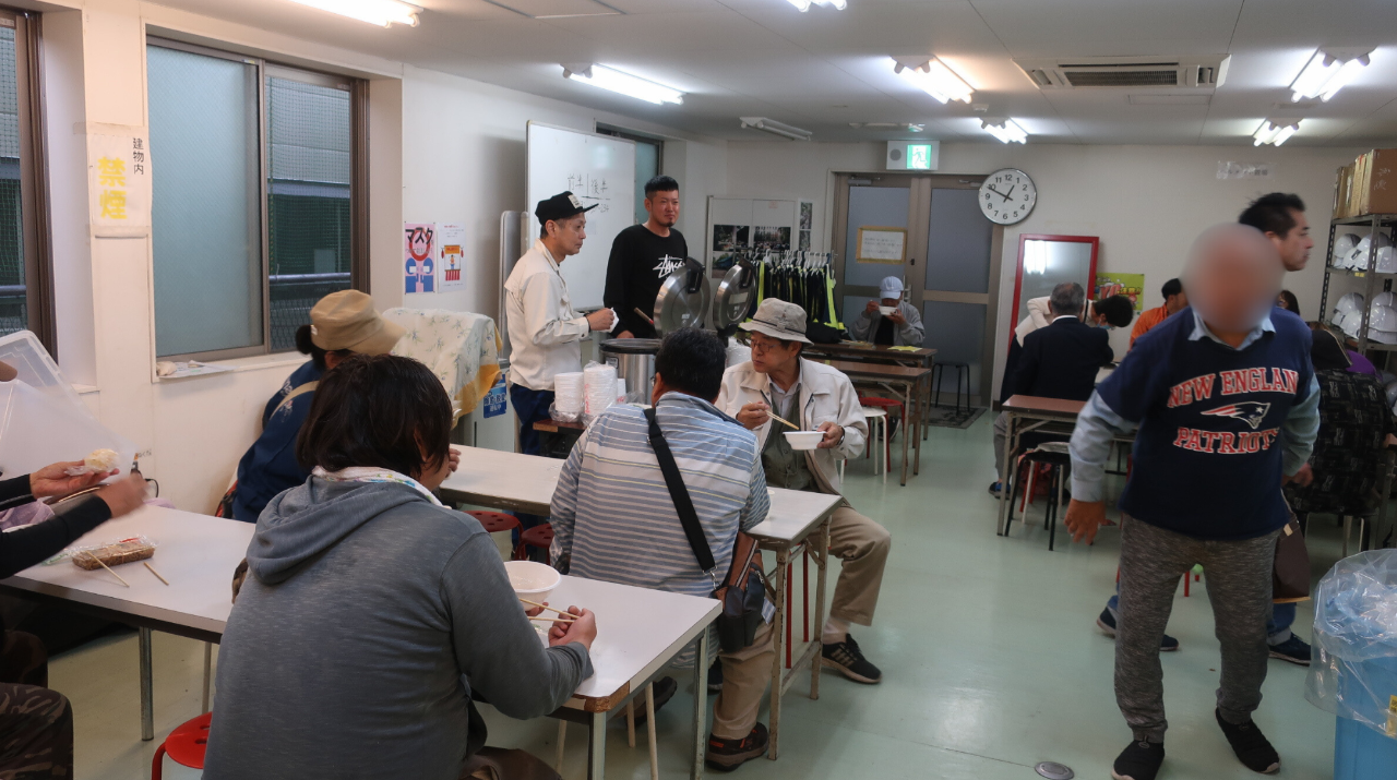 『25周年記念イベントの2部として特別清掃事業のスタッフ、あいりんシェルタースタッフを中心に模擬店を実施しました。当日は日頃のおこないがいいのか?天候にも恵まれ、朝早くからおにぎり、焼きそば、豚汁、ぜんざい、フランクフルトを作る準備をしました。私にとっては慣れない作業で、他のスタッフからは笑いあり叱咤激励あり。特にラップを切るのには悪戦苦闘している姿が笑いを誘いながら12時開店に向け準備を進めました。12時開店と同時に特別清掃の就労者、イベント1部の参加者、シェルター利用者の順に入っていただき一時は居場所1階が座れないほど盛況になり急遽2階を開放するなど大盛況となりました。参加した方の笑顔を見ると頑張って準備してよかったと思えました。また、これからもこの笑顔をいつまでも見ていけるように活動していこうと思いました。』