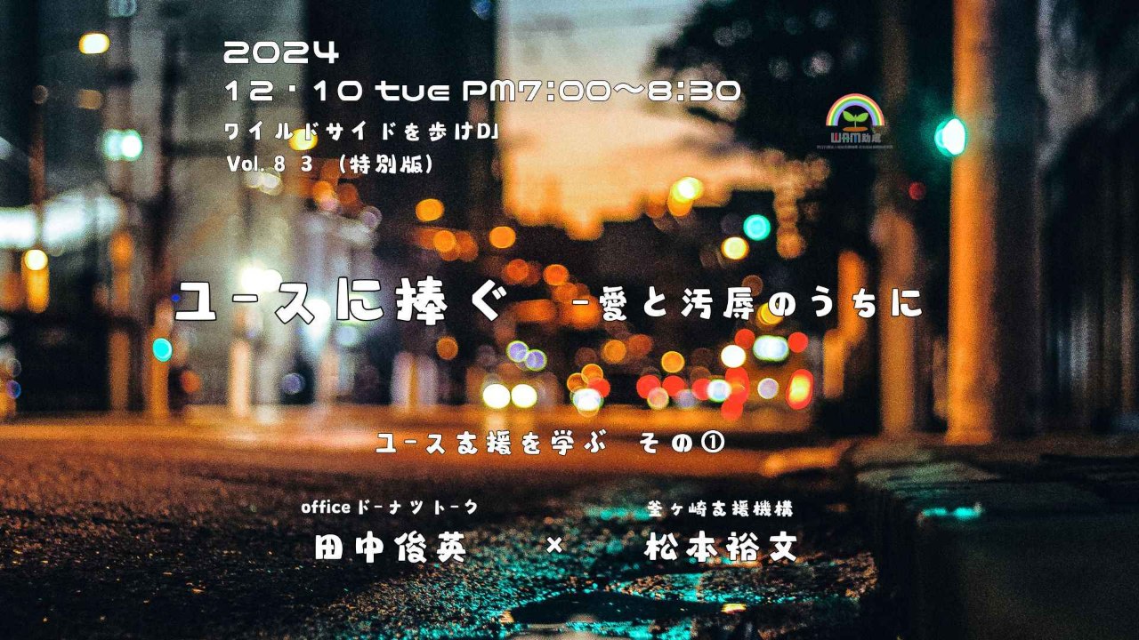 萩之茶屋のひょこひょこおじさん松本裕文がうっかり7月から始めたユースの居場所ヨル・ベース、今利用の若者たちが支えてくれています。こちらのライブ配信は、ユース支援の専門家officeドーナツトークの田中俊英さんが、甘々の松本にツッコミを入れ厳しく指導するひと時です。田中さんのユース支援の秘技を垣間見ることができるかもしれませんね!ご期待ください!