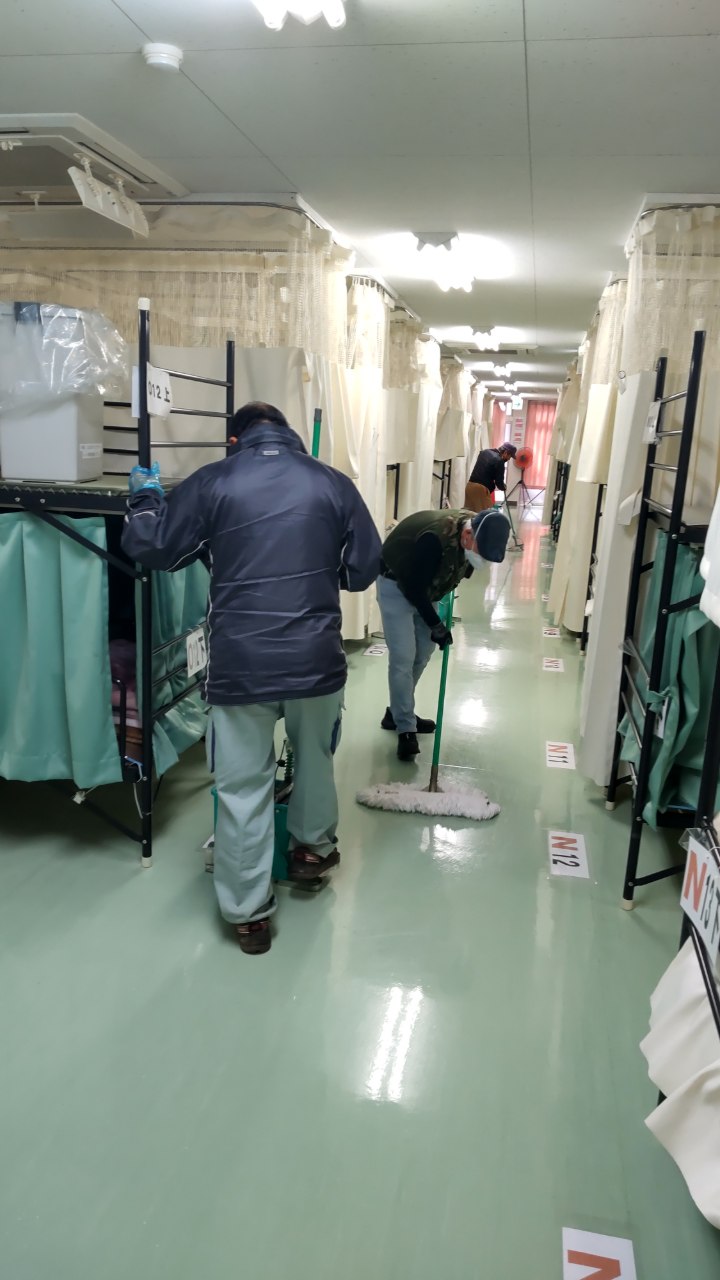 あいりんシェルターでは、宿泊者に快適に過ごしていただくために1時間ごとに換気や清掃を行います。