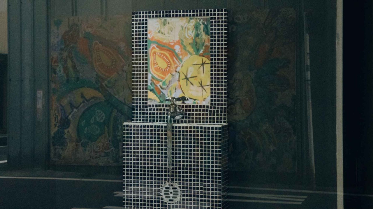 本展示では、レジンでできた水が、まるで蛇口から床へと流れ落ちていっているかのような新作のインスタレーション作品である。