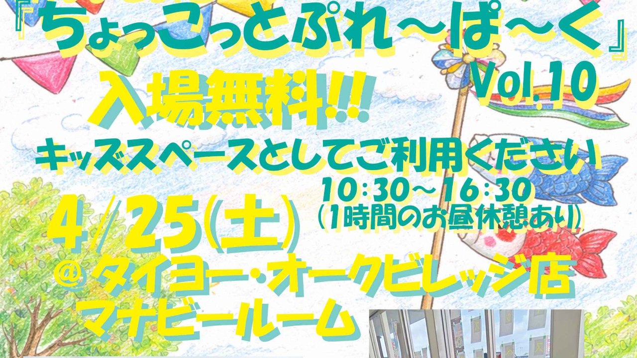 2026-04-11 21:00【キッズスペース】『ちょこっとぷれ~ぱ~く』vol.10、開催決定!!【入場無料】活動の根幹を知ってもらうために、簡易プレーパーク『ちょこっとぷれ~ぱ~く』を開催しています。 次回vol.10、です! 【会場】タイヨー・オークビレッジ店マナビールーム 【日時】2025/04/25(土) 10:30~16:30(うち1時間お昼休憩あり) 毎月第4土曜はプレパの日!ご来場おまちしています!!2026-04-11 21:00【キッズスペース】『ちょこっとぷれ~ぱ~く』vol.10、開催決定!!【入場無料】活動の根幹を知ってもらうために、簡易プレーパーク『ちょこっとぷれ~ぱ~く』を開催しています。 次回vol.10、です! 【会場】タイヨー・オークビレッジ店マナビールーム 【日時】2025/04/25(土) 10:30~16:30(うち1時間お昼休憩あり) 毎月第4土曜はプレパの日!ご来場おまちしています!!