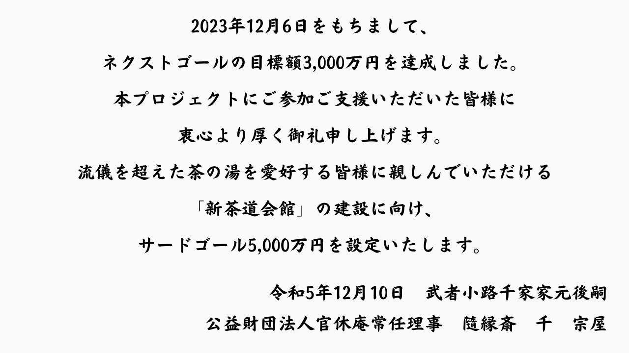 2023年12月6日をもちまして、官休庵建物修復プロジェクト「五百年以上歴史ある茶の湯文化を次世代へ」クラウドファンディングは、予定期限の1ヶ月と25日を前にネクストゴールの目標額である3,000万円を達成、12月10日現在377名のご参加、ご支援を賜り、総額30,275,000円の浄財をお預かりいたしました。本プロジェクトにご参加ご支援いただいた皆様、企画の立案に当たってご助力いただいた公益財団法人官休庵の理事・評議員の皆様、社中各位、職分、事務局、そして茶道流儀として初めての試みに対しアドバイスとご助力を惜しまず頂いたコングラント(株)様には衷心より厚く御礼申し上げます。