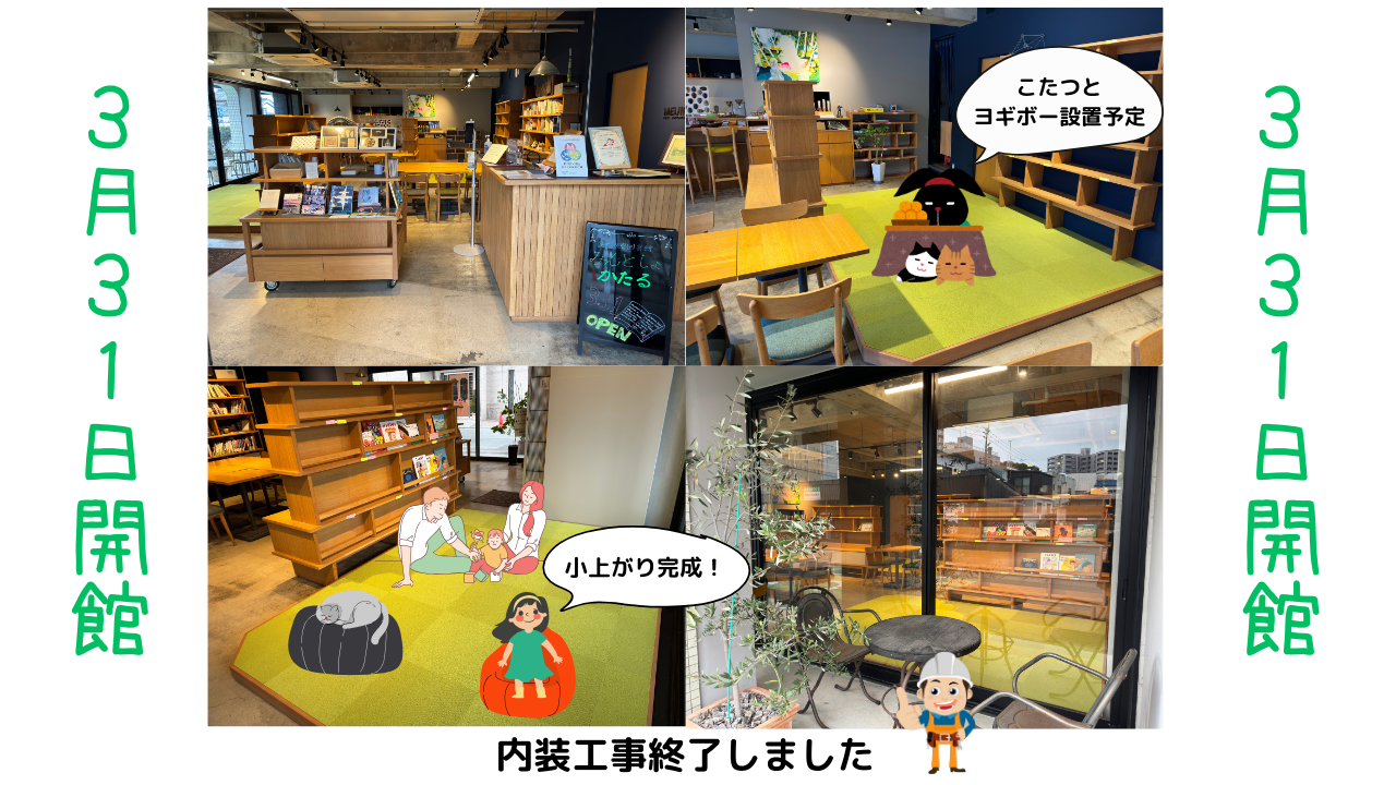 2024-03-26 21:39内装工事完了しました!!本日工事完了し、小上がりが完成しました。 本棚も移動し、照明を追加したので明るくなりました〜。 あとは、本棚オーナーがもっと集まれば完成です。 お知り合いの方でご興味ある方がいればぜひご案内ください。 明日27日午後13時から15時半までは見学できます。 お時間あればぜひ足をお運びください。2024-03-26 21:39内装工事完了しました!!本日工事完了し、小上がりが完成しました。 本棚も移動し、照明を追加したので明るくなりました〜。 あとは、本棚オーナーがもっと集まれば完成です。 お知り合いの方でご興味ある方がいればぜひご案内ください。 明日27日午後13時から15時半までは見学できます。 お時間あればぜひ足をお運びください。