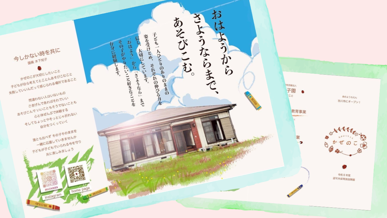 2025-05-24 09:30森のようちえん かぜのこ、三つ折りチラシ出来上がりました!新施設園長の木下ともこです。 【おはようからさようならまで あそびこむ】 子どもが子どもらしくあそびこめる場所を存在させていく!を目標に活動し、吉川の土地でご縁をいただくことができました。 子どもたちが心を開放して笑いあい、けんかし、走り回り、絵本の世界に入りこみ、虫や草花とたわむれる日々を思い描きながら関わるみんなで作成しました。 今印刷の手配をして、到着を待っているところです。 入園先を探すお母さんお父さん、皆さまに届きますように!2025-05-24 09:30森のようちえん かぜのこ、三つ折りチラシ出来上がりました!新施設園長の木下ともこです。 【おはようからさようならまで あそびこむ】 子どもが子どもらしくあそびこめる場所を存在させていく!を目標に活動し、吉川の土地でご縁をいただくことができました。 子どもたちが心を開放して笑いあい、けんかし、走り回り、絵本の世界に入りこみ、虫や草花とたわむれる日々を思い描きながら関わるみんなで作成しました。 今印刷の手配をして、到着を待っているところです。 入園先を探すお母さんお父さん、皆さまに届きますように!