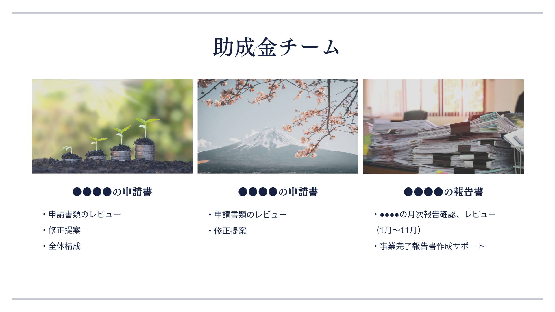 期間中の3ヶ月間に申請予定の助成金申請書類(下の画像では申請先は伏字にしております)のレビュー、修正提案、全体構成の提案もいただき、自分たちの活動と成果をしっかりと正確に言語化していく手法を学ばせていただきました。