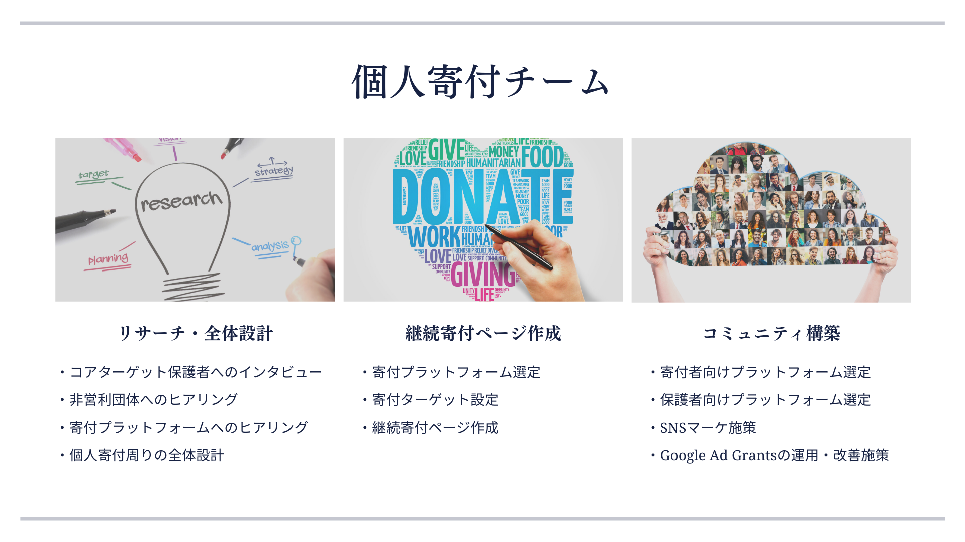 その後に、寄付決済プラットフォームの選定を行い、ターゲット設定、継続寄付ページの作成を進めていただき、寄付者向けのコミュニティ構築の企画案、SNSマーケティングの立案、Google Ad Grantsの運用と改善施策まで、3ヶ月間で驚くほどのものをゼロから形にして頂きました。
