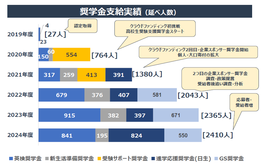 多くの企業・個人の方からのご寄付を原資に、2019年~2024年度累計で、8989名へ奨学金を支給しました。