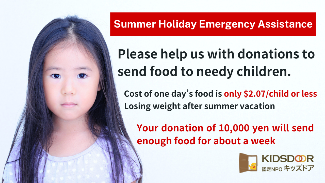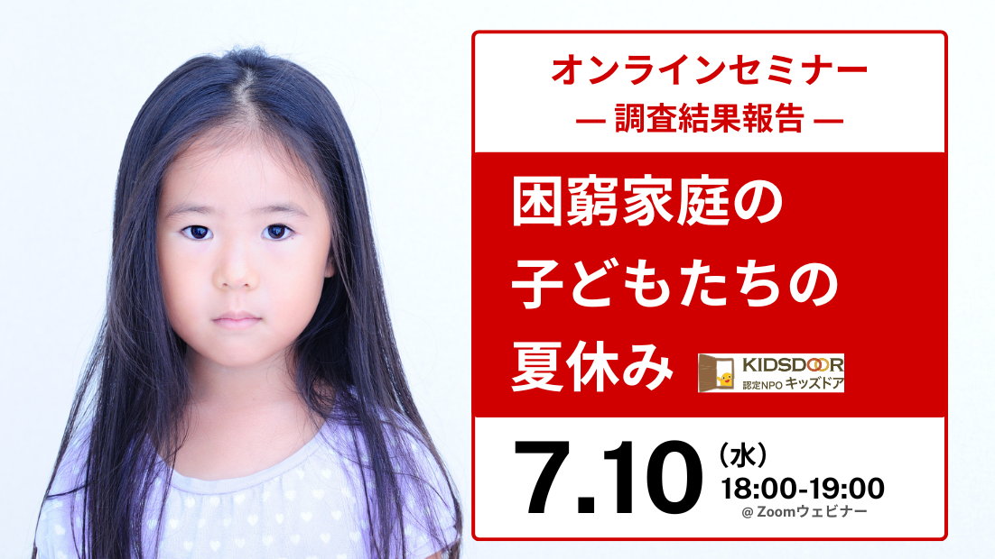 2024-06-27 16:00【7/10(水)配信】困窮家庭の子どもたちの夏休み―調査結果より―(オンラインセミナー)6月に実施した最新調査結果の詳細を交え、困窮家庭の子どもたちが夏休みに抱える課題についてお伝えします。2024-06-27 16:00【7/10(水)配信】困窮家庭の子どもたちの夏休み―調査結果より―(オンラインセミナー)6月に実施した最新調査結果の詳細を交え、困窮家庭の子どもたちが夏休みに抱える課題についてお伝えします。