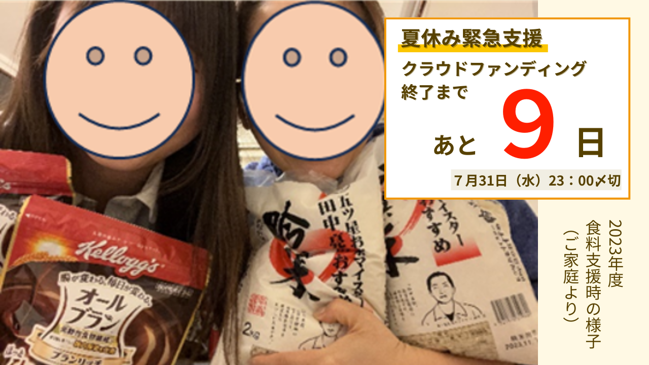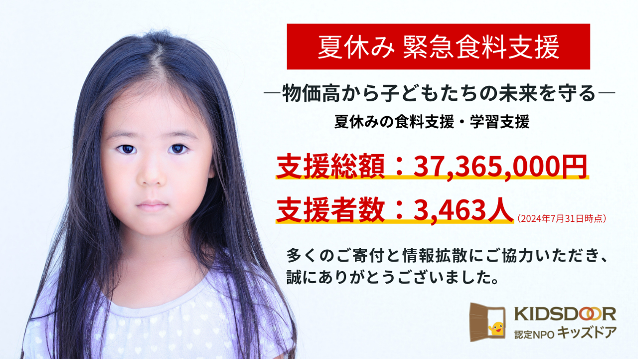 2024-07-23 01:38【御礼】目標金額3,000万円を達成しました6月より開始しました「夏休み緊急支援クラウドファンディング」について、本日7月23日に当初の目標金額を達成することができました。 多大なるご寄付と情報拡散にご協力いただき、誠にありがとうございました。皆様からの温かいご支援に、改めまして深く感謝申し上げます。2024-07-23 01:38【御礼】目標金額3,000万円を達成しました6月より開始しました「夏休み緊急支援クラウドファンディング」について、本日7月23日に当初の目標金額を達成することができました。 多大なるご寄付と情報拡散にご協力いただき、誠にありがとうございました。皆様からの温かいご支援に、改めまして深く感謝申し上げます。