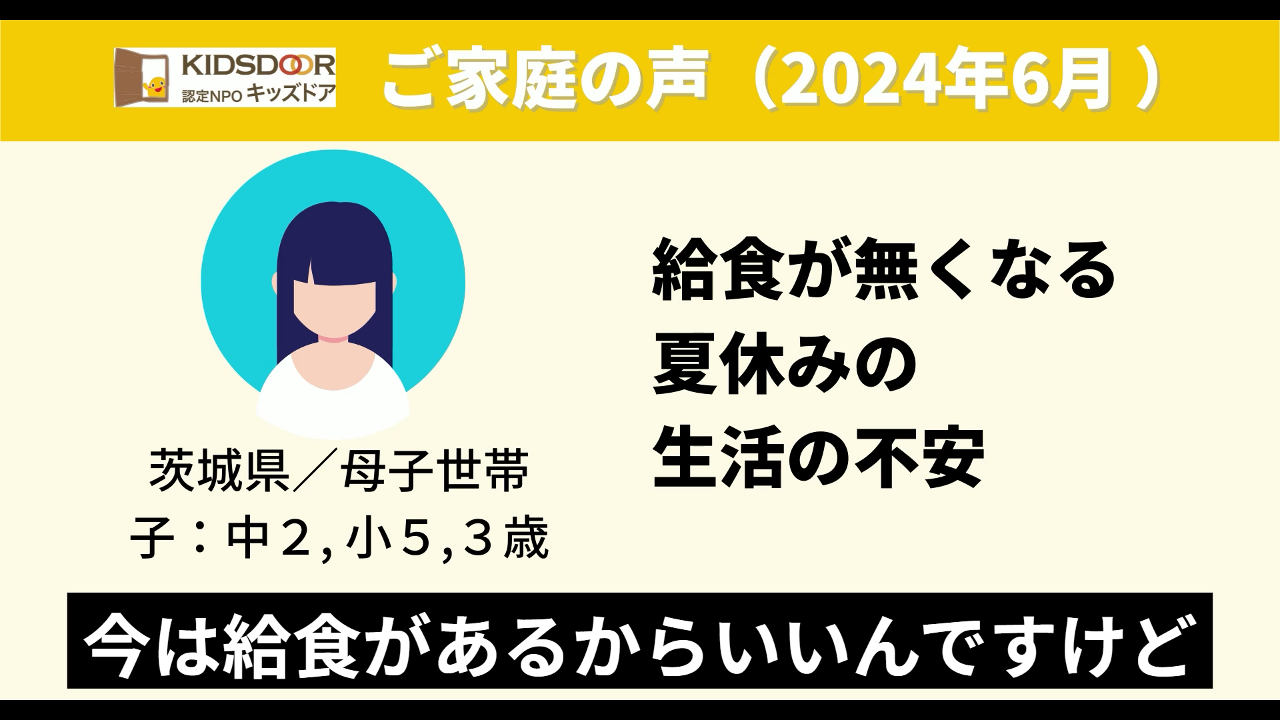 2024-07-22 17:00【終了まで―あと9日】夏休みの食料、居場所、体験すべてが足りない(ご家庭の声)「初めて夏休みを家で一人で過ごすんですけど、もちろん食料の面、お昼ご飯の心配があります。単に家にずっといると暑いし、現実的にクーラー代もかかる。食料の支援はもちろん一番嬉しいです」2024-07-22 17:00【終了まで―あと9日】夏休みの食料、居場所、体験すべてが足りない(ご家庭の声)「初めて夏休みを家で一人で過ごすんですけど、もちろん食料の面、お昼ご飯の心配があります。単に家にずっといると暑いし、現実的にクーラー代もかかる。食料の支援はもちろん一番嬉しいです」