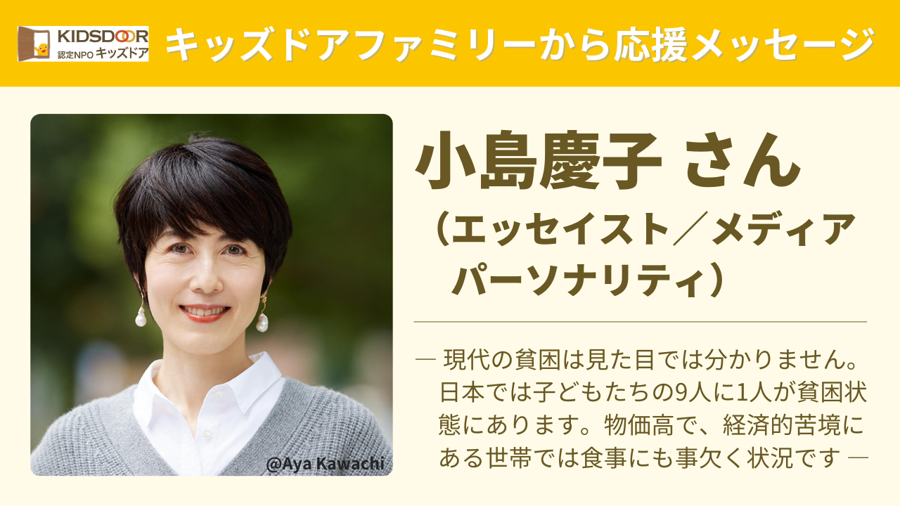 活動を支えていただいている「キッズドアファミリー」の小島慶子さんより、応援メッセージが届きました!