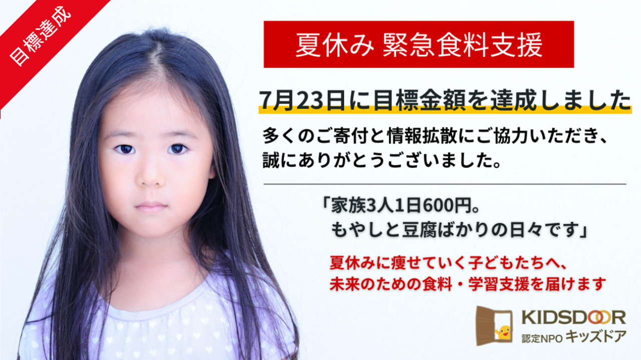 皆様からのご寄付は、困窮家庭の子どもたちが、給食のなくなる夏休みを乗り越えるための「食」と「心」の支えになります。食事もままならない子どもたちの未来をつなぐため、力強いご支援をどうぞよろしくお願いいたします。