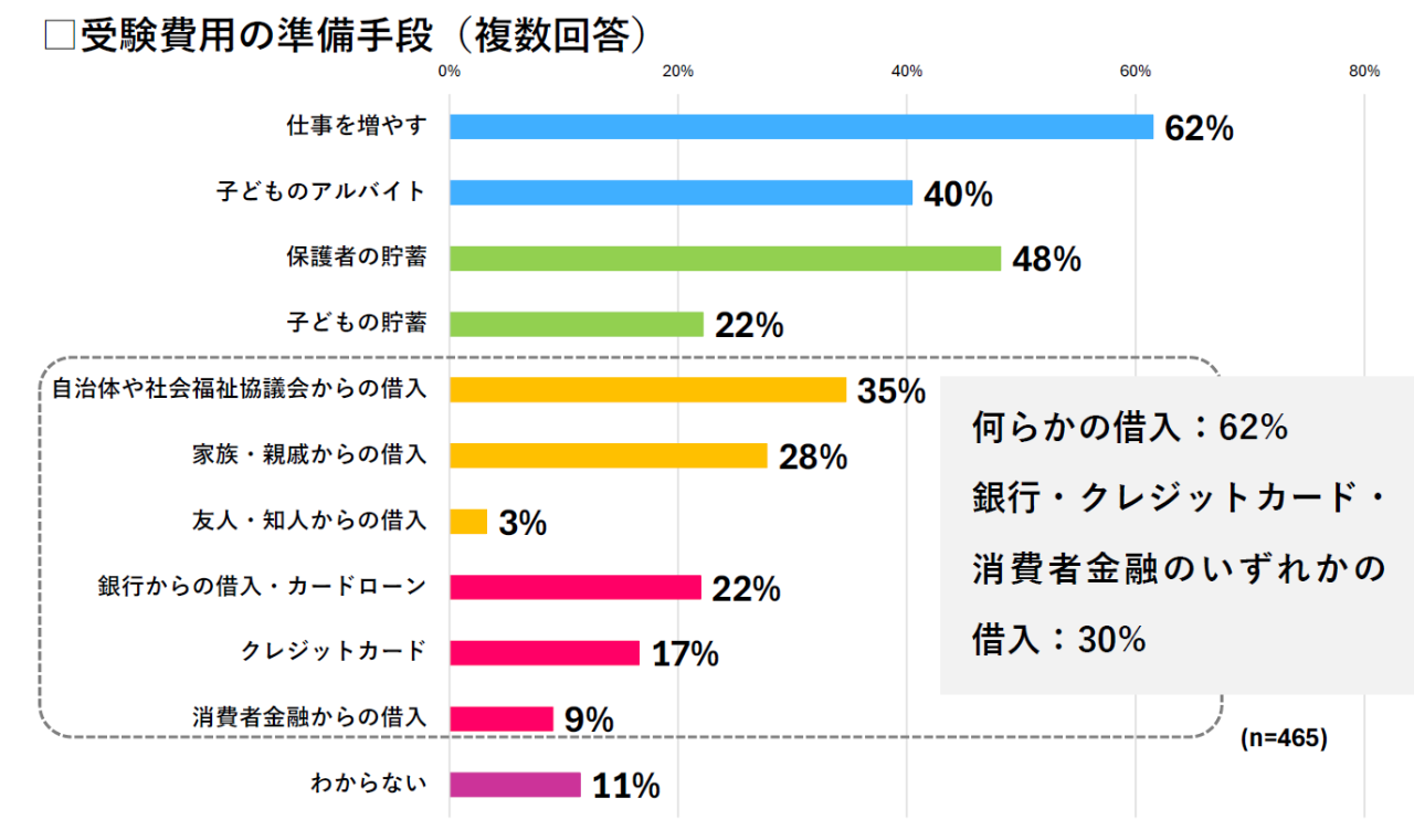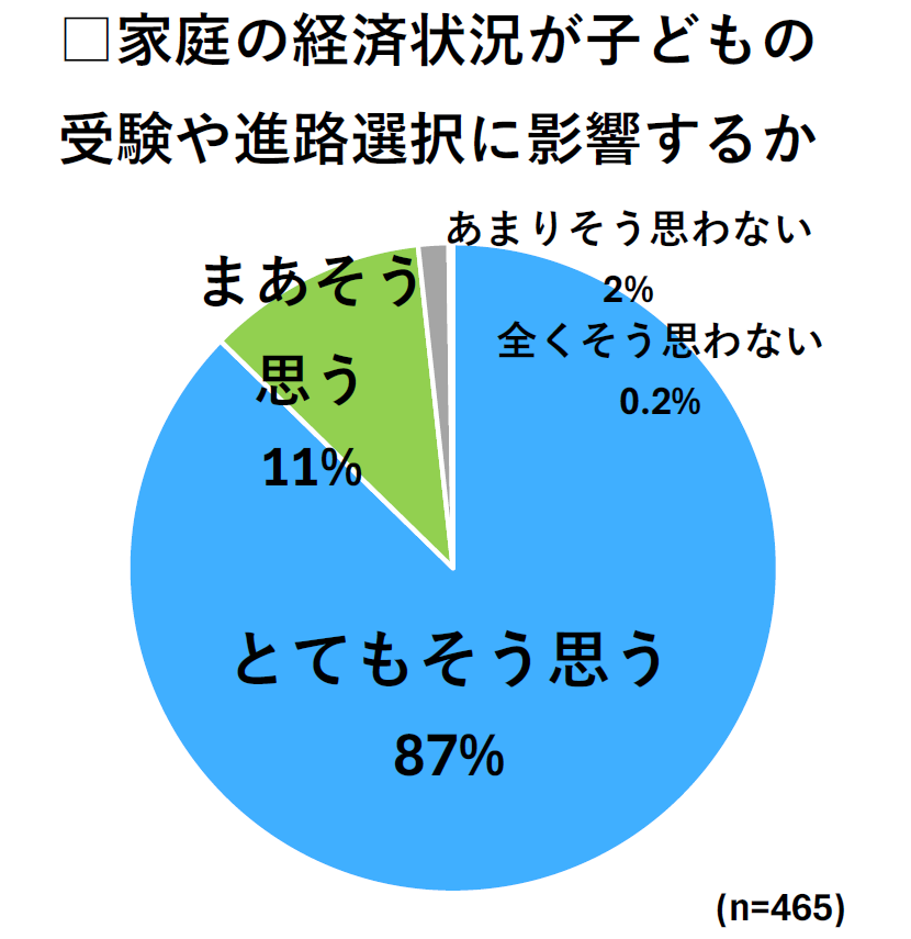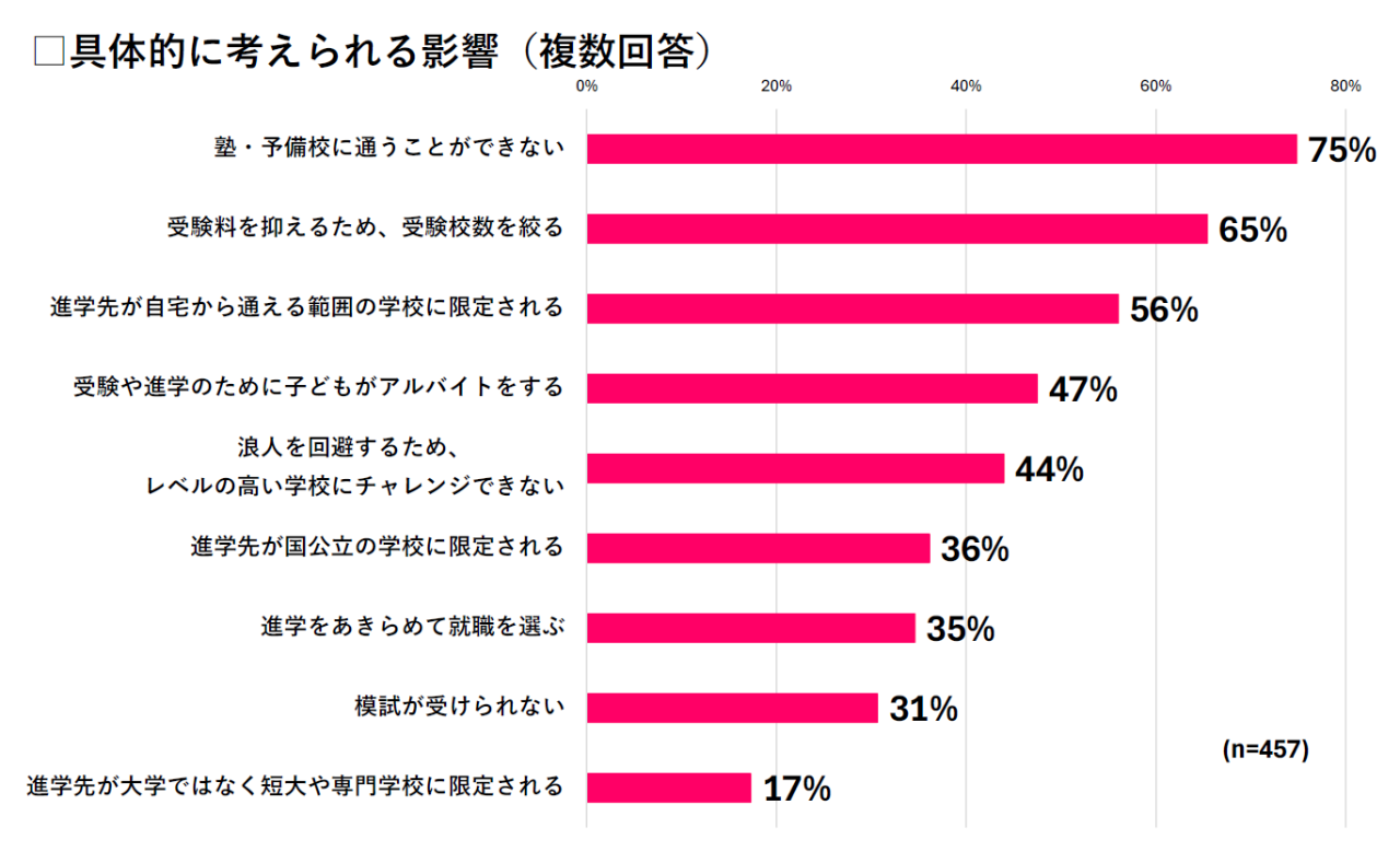 ほぼ全ての保護者が「家庭の経済状況が子どもの大学等受験や進路選択に影響する」と回答。具体的な影響として「塾や予備校に通うことができない」だけでなく、「受験校数や進学先の制限」や「子どもがアルバイトをする」等の影響に加え、「進学自体をあきらめる」事例が報告されています。