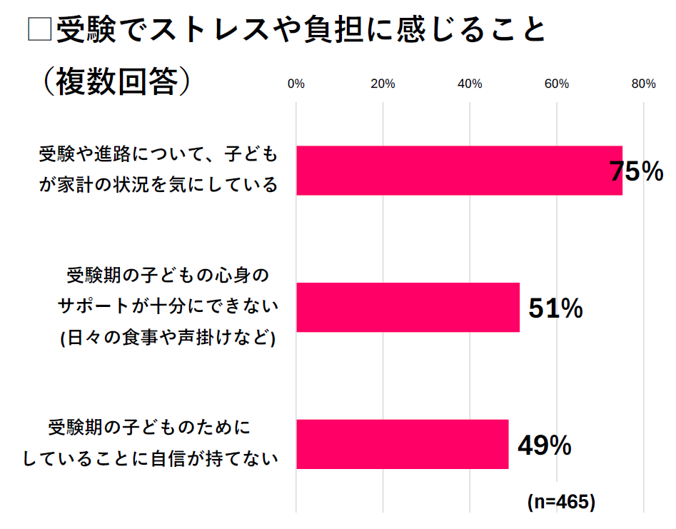 保護者の75%にとって「受験や進路について子どもが家計の状況を気にしている」こと自体が、精神的負担になっています。また上述のように受験期は特に経済的負担が大きくなるため、「子どもの心身のサポートが十分にできない」など、現在の生活困窮度が高くなっている傾向があります。