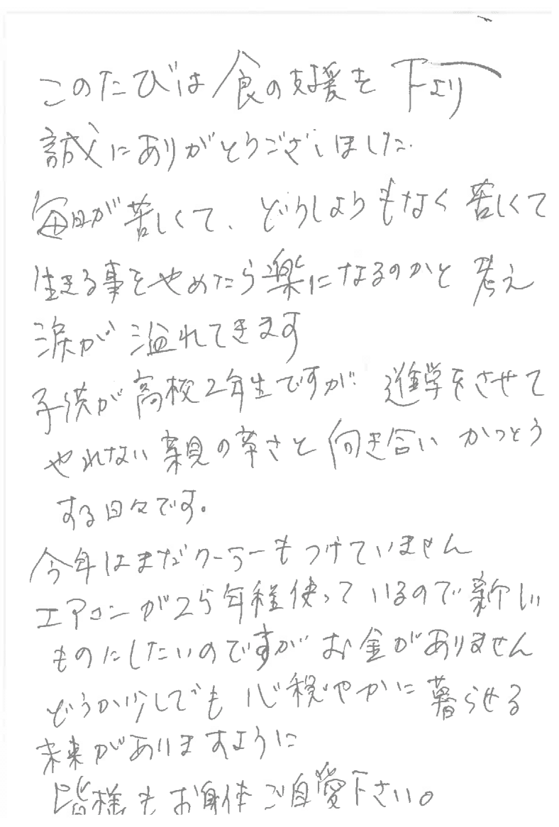 「非課税世帯などは支援があっても、中間層には支援がない。6人家族なので生活はいつもギリギリ。生活の為に借金ばかり増え、子供達の学費も貯められず、塾にも行かせてあげられない。塾に行かないと成績が伸びない。お金がない世帯の子供達は将来日雇いや派遣など正規社員にもなれないのだろうかと思って子供達には申し訳ないなと思ってしまう。お金がない人は子供も産んではダメなんだなと実感している毎日です」