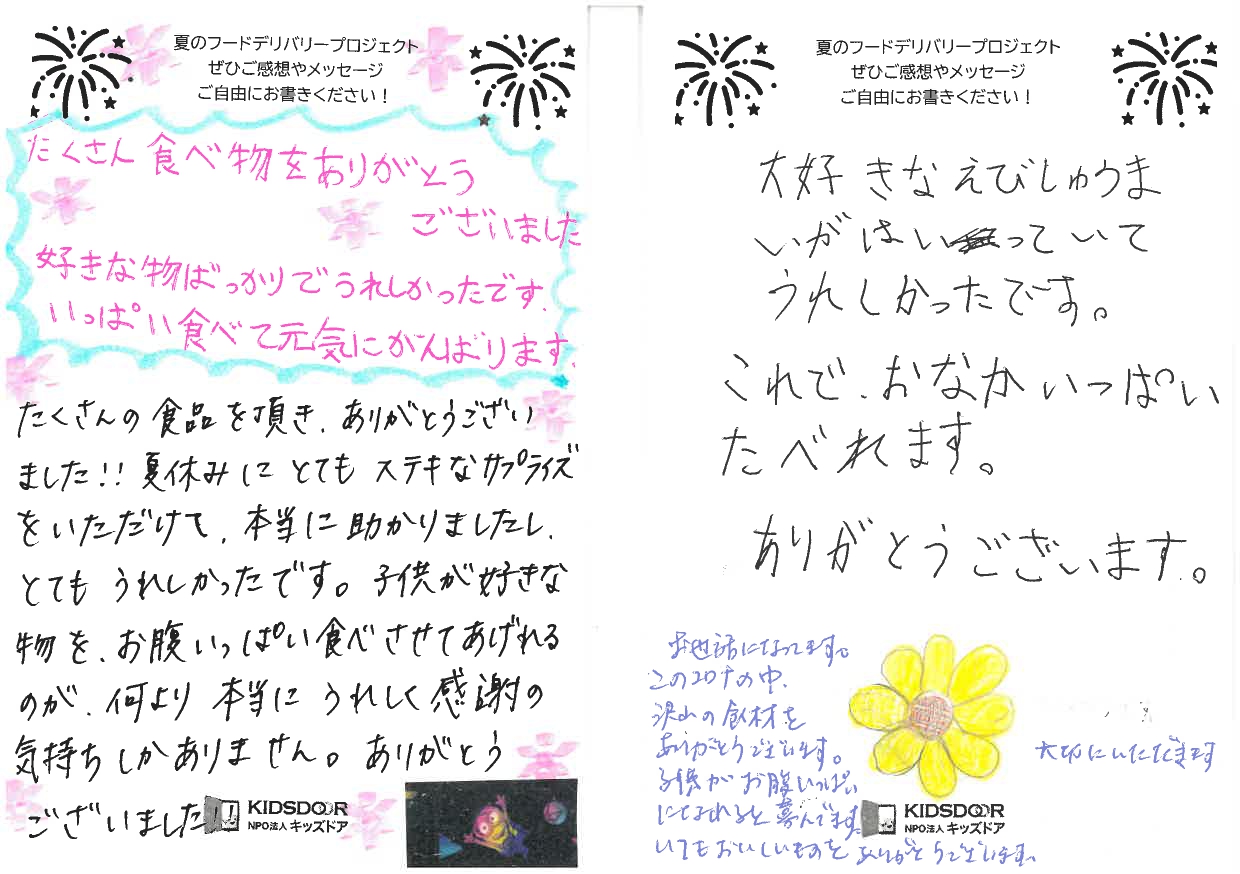こうしたファミリーサポート事業に携わる中で、ご家庭からの声をお聞きする機会が多くあります。昨年の夏休みも食料支援を行いましたが、その際にもたくさんのお葉書をいただきました。そこではご支援いただいた方やキッズドアへの感謝の言葉を多くいただきますが、生活の辛さや苦しさを吐露するものも少なくありません。現実の厳しさを目の当たりにすると、このような支援の必要性を切に感じるとともに、心がとても苦しくなります。