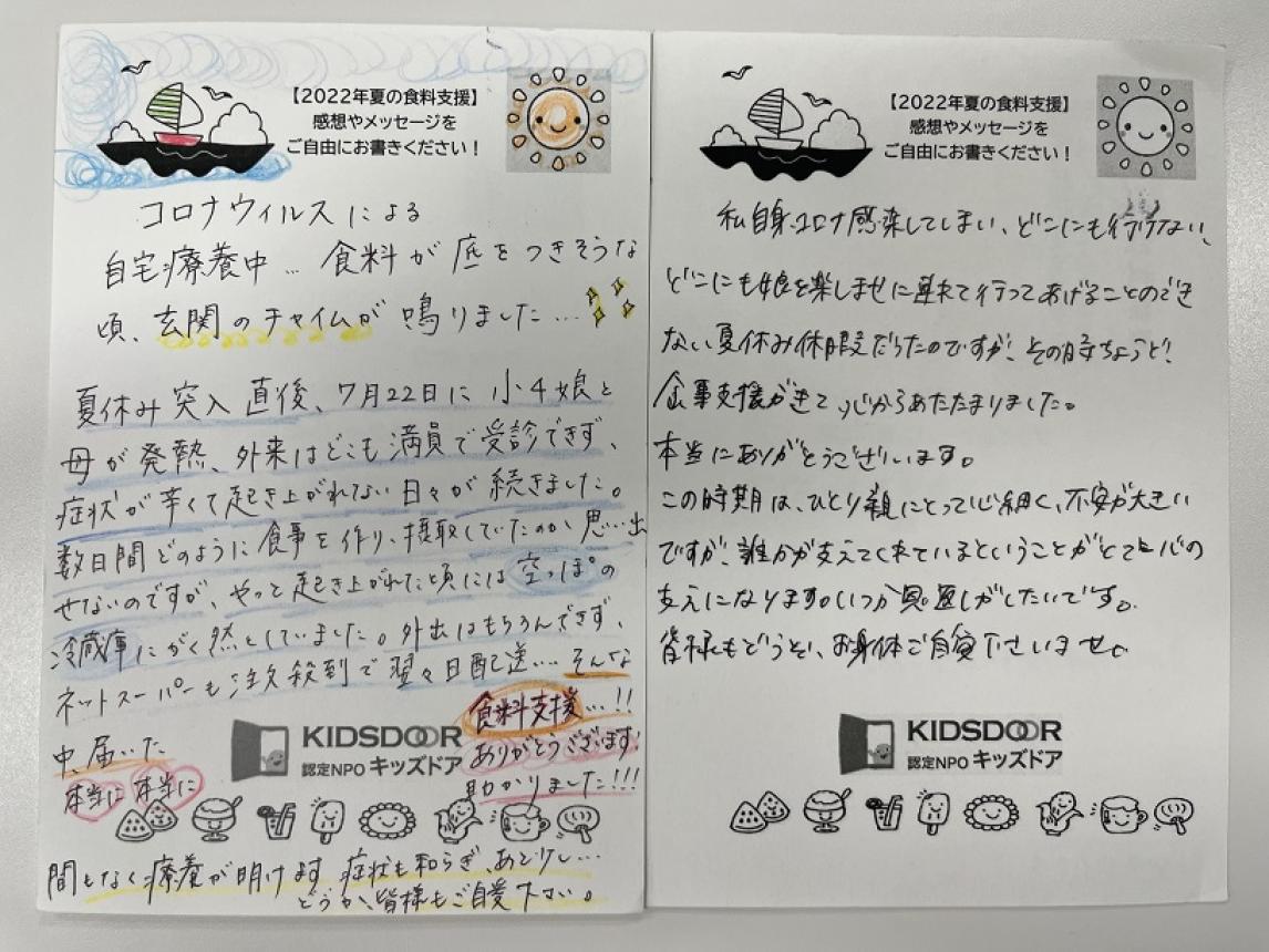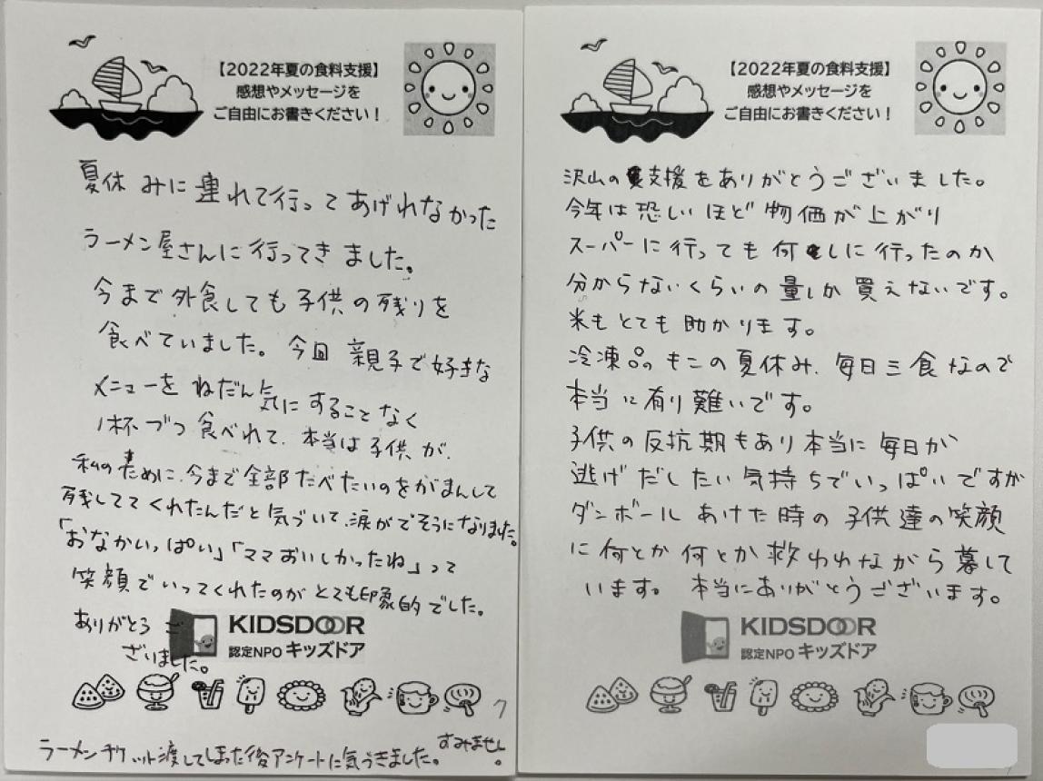 2022-12-23 14:59食料をお届けしたご家庭からおハガキが届き始めました!早速食料を受け取られたご家庭より、多くのメッセージが届いています。2022-12-23 14:59食料をお届けしたご家庭からおハガキが届き始めました!早速食料を受け取られたご家庭より、多くのメッセージが届いています。