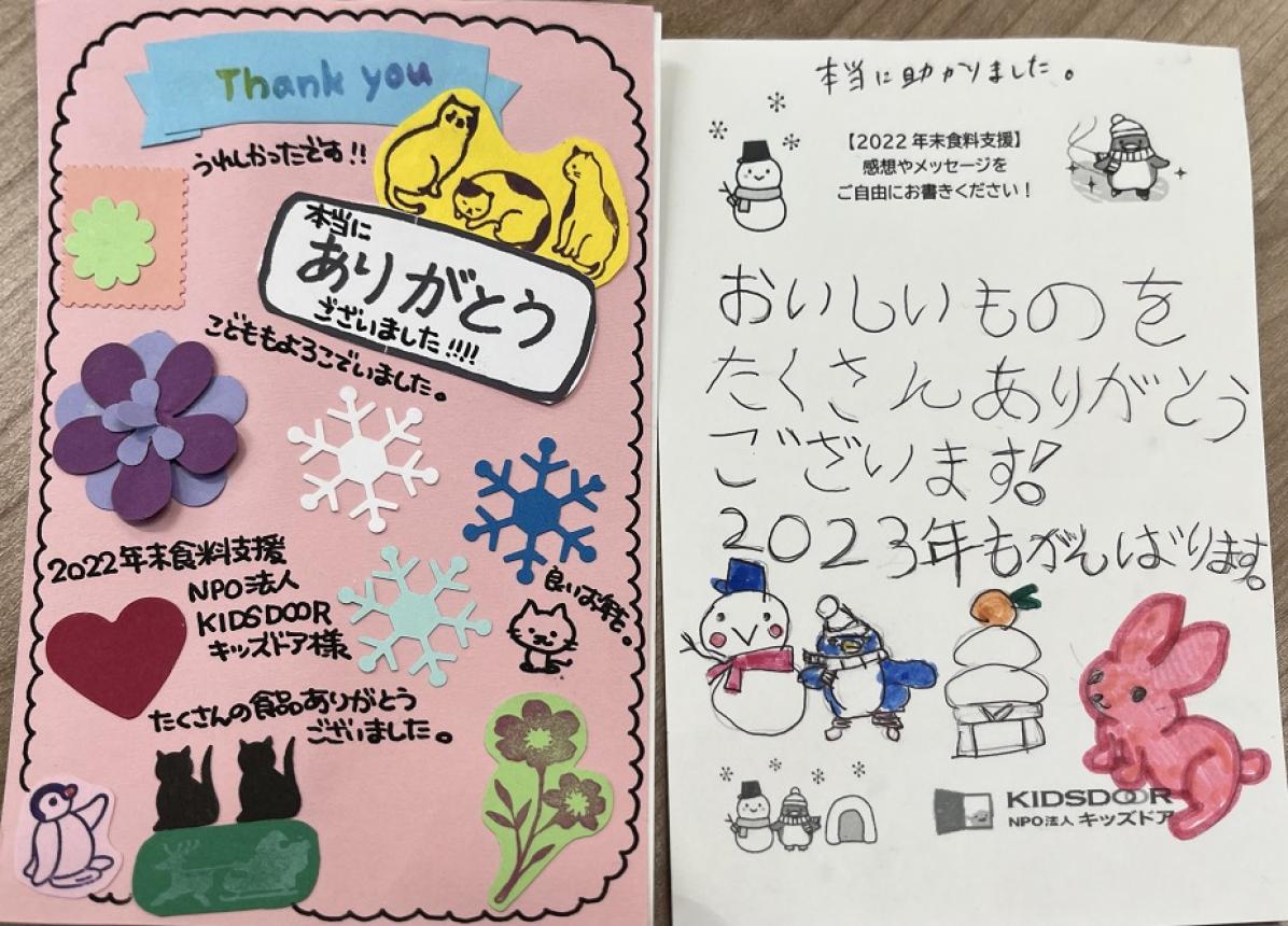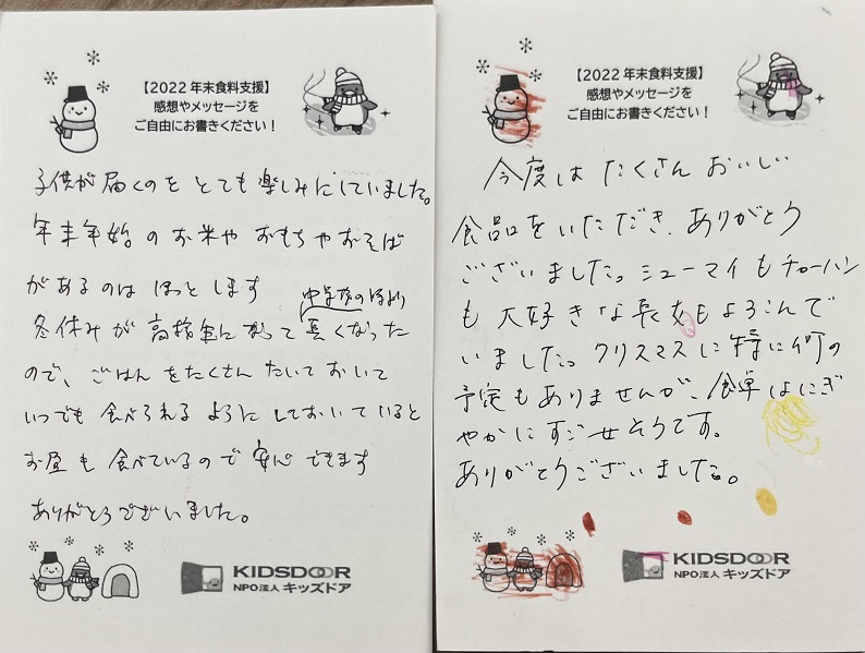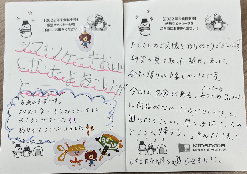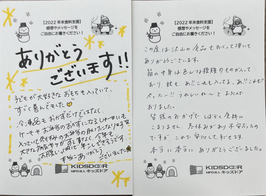 食料をお届けしたご家庭からおハガキが届き始めました!