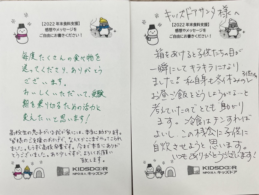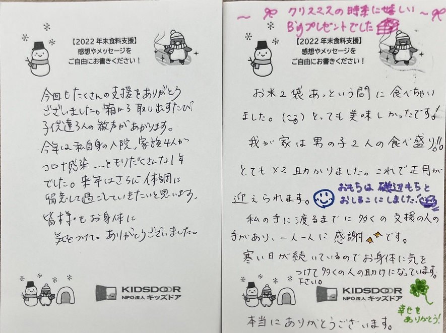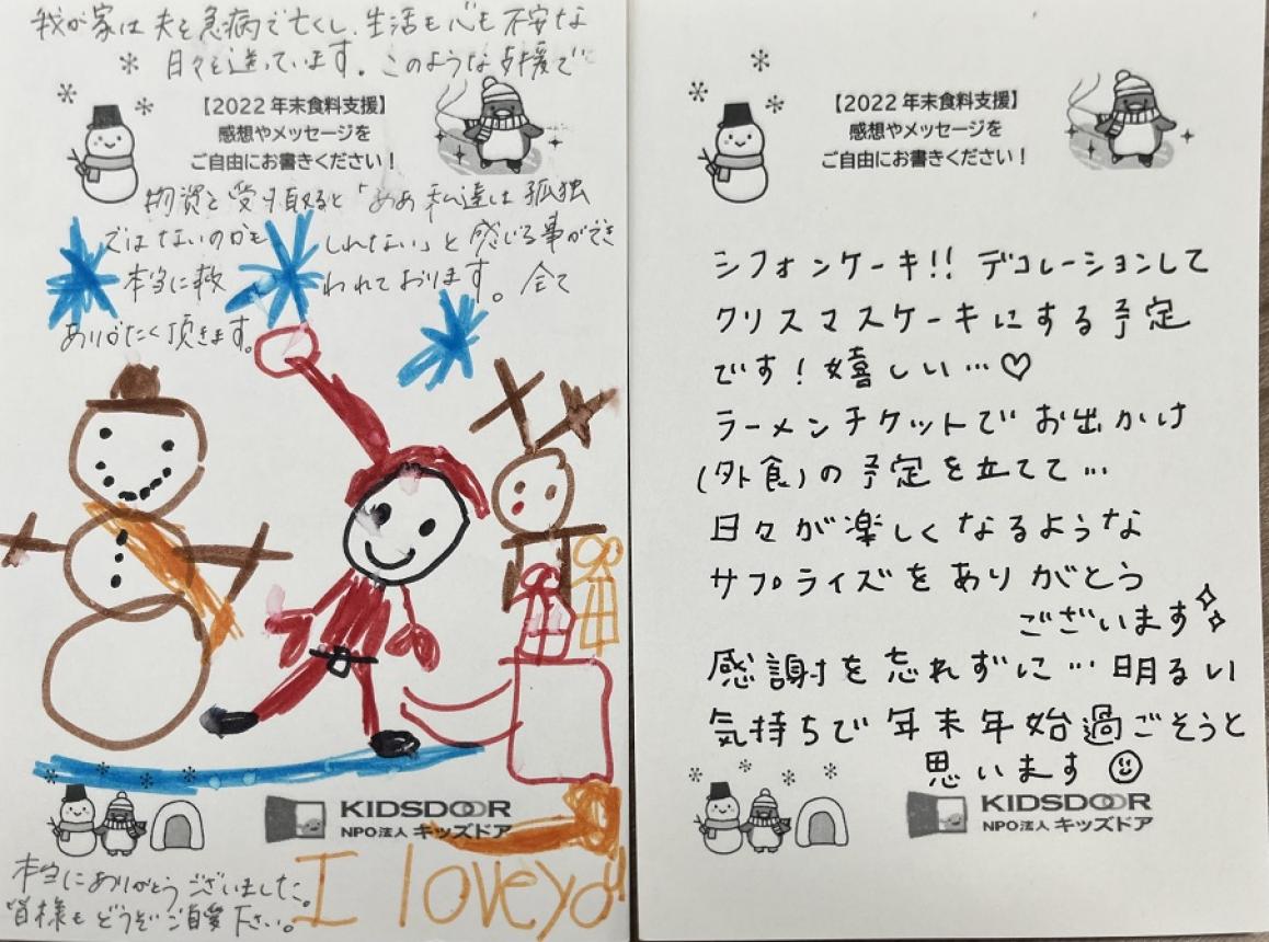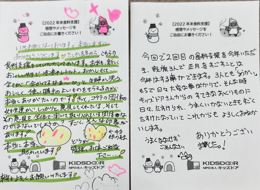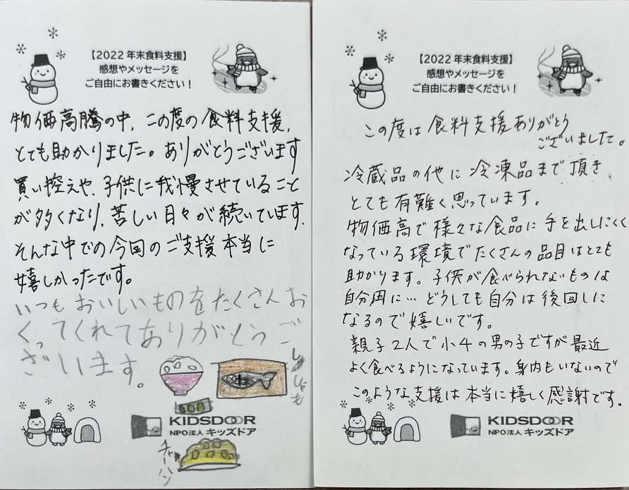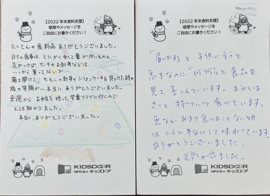 またその後も食料を受け取られたご家庭より、多くのおハガキが届いています。