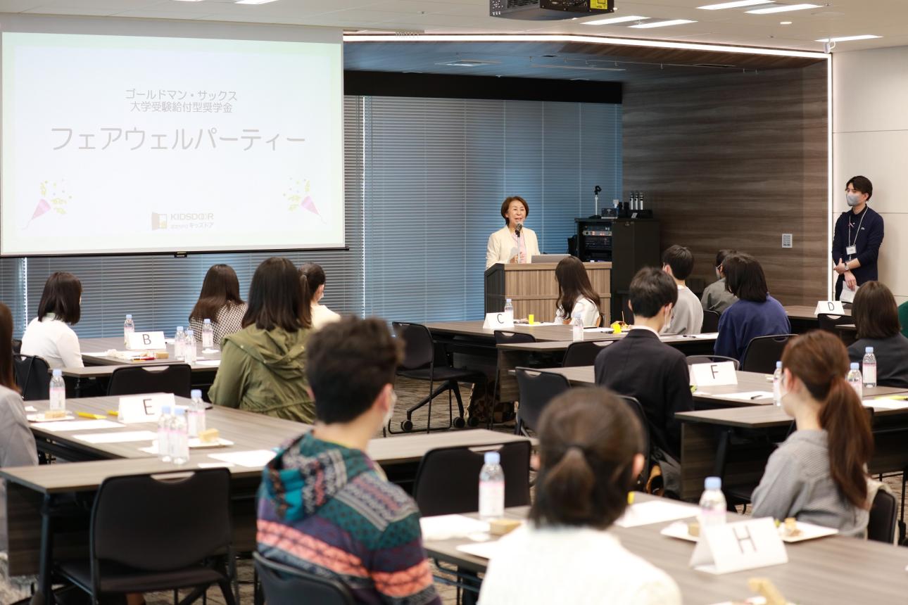 フェアウェルパーティには、24名の受給生が集まり、ゴールドマン・サックス様のご担当者、キッズドア理事長の渡辺、キッズドア基金松見代表から、お祝いの言葉が贈られました。