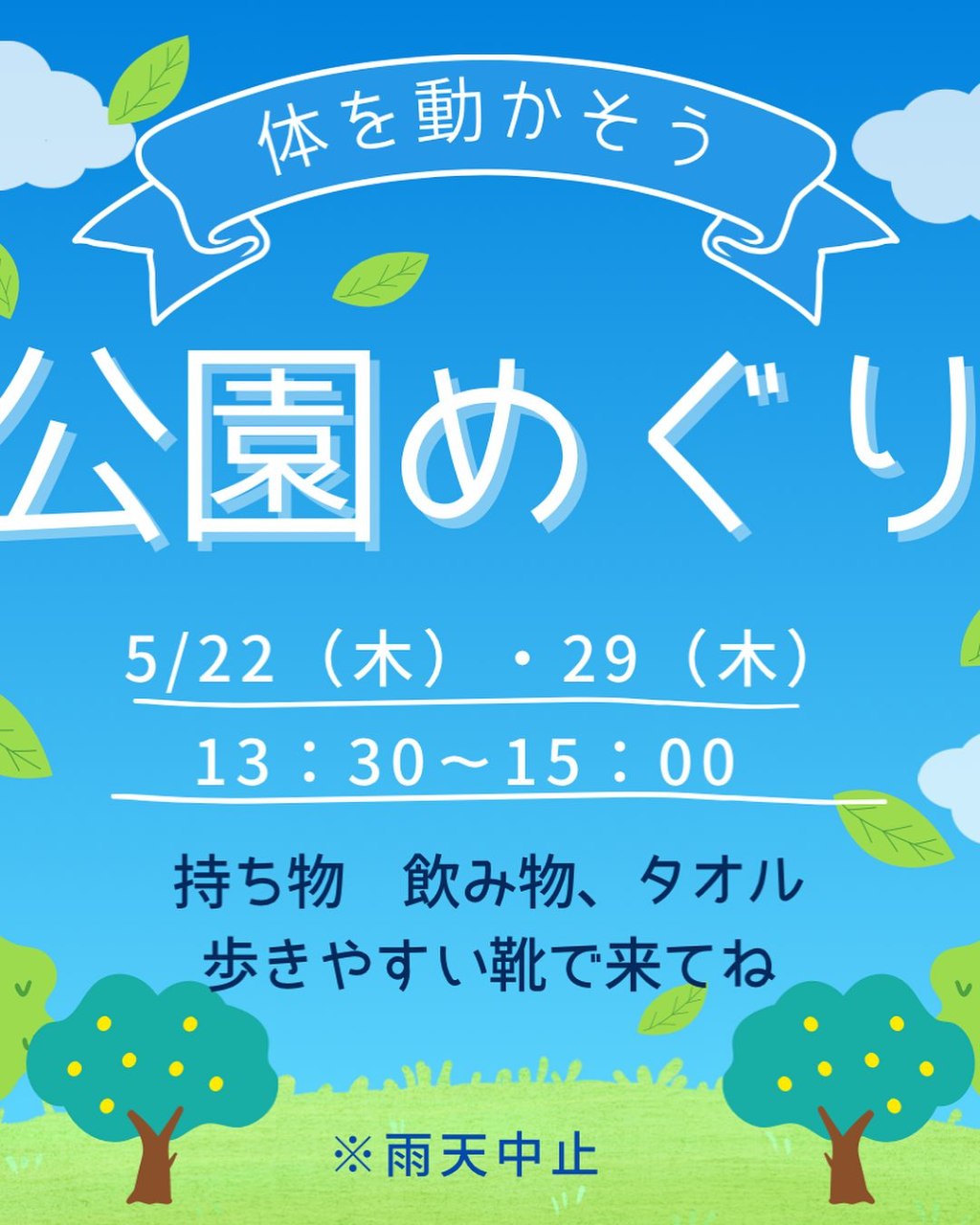 気候の良い時期なので、近所の公園に遊びに行きたいと思います。近所にはいくつか公園があるので、散歩がてら散策もする予定です。