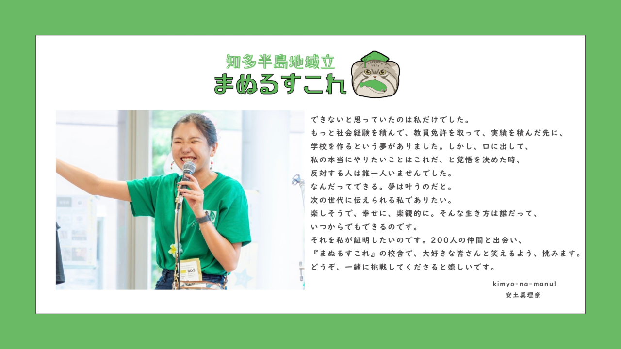 『まぬるすこれ』の校舎で、大好きな皆さんと笑えるよう、挑みます。