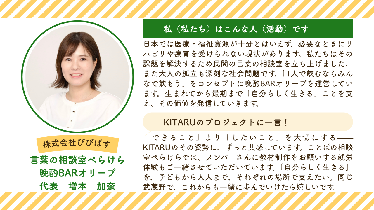 増本さんは、言語聴覚士として活動する中で、そのリハビリテーションにたどり着かない方がいることに目を向け、言葉の相談室を立ち上げました。また、就労支援にも興味があり、KITARUには、就労体験の場を提供していただいています。 市民活動『MAZERU』としても一緒に活動していて、とにかく発想が豊かで、いつも刺激を受けています。