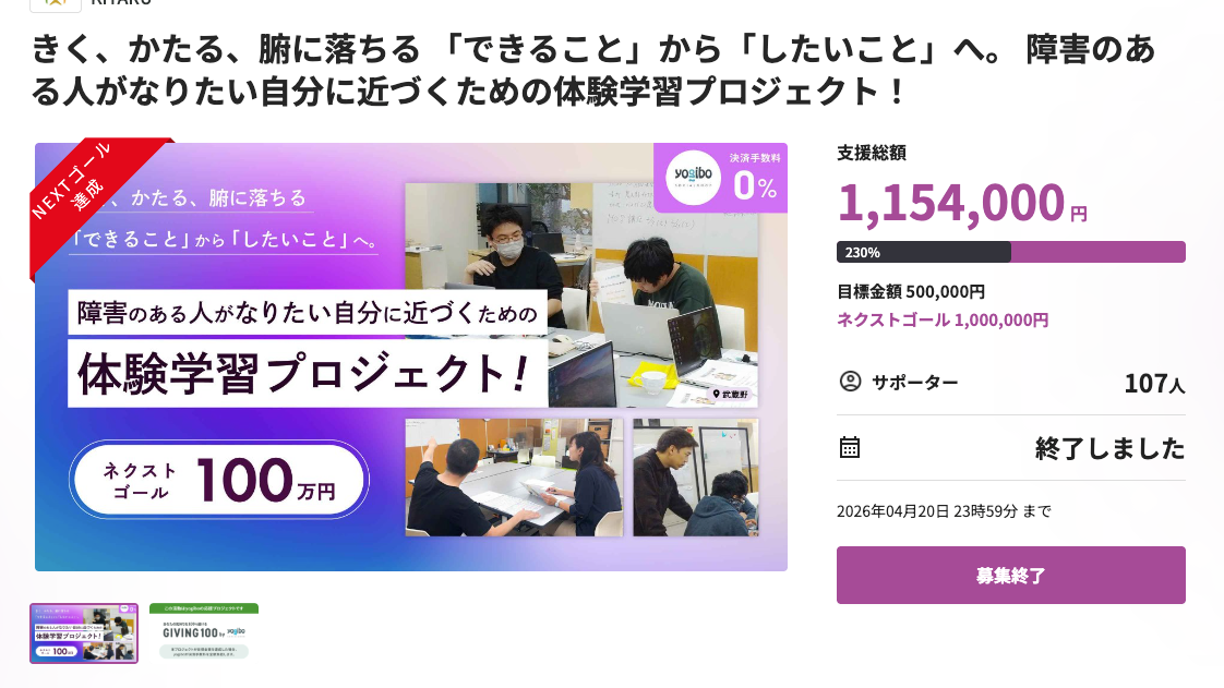 皆様の多大なるご支援により、1,154,000円ものご寄付をお預かりし、無事にクラウドファンディングで予定をしていた目標金額を達成して終了することができました。