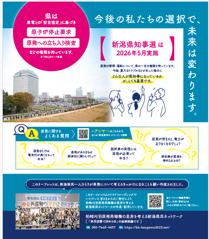 柏崎刈羽原発再稼働の今、「私たちの選択で、未来は変わります」と多くの県民へ伝える、リーフレット「あの経験を、次の選択へ。」を制作、 新潟全県40万軒へ届けます。