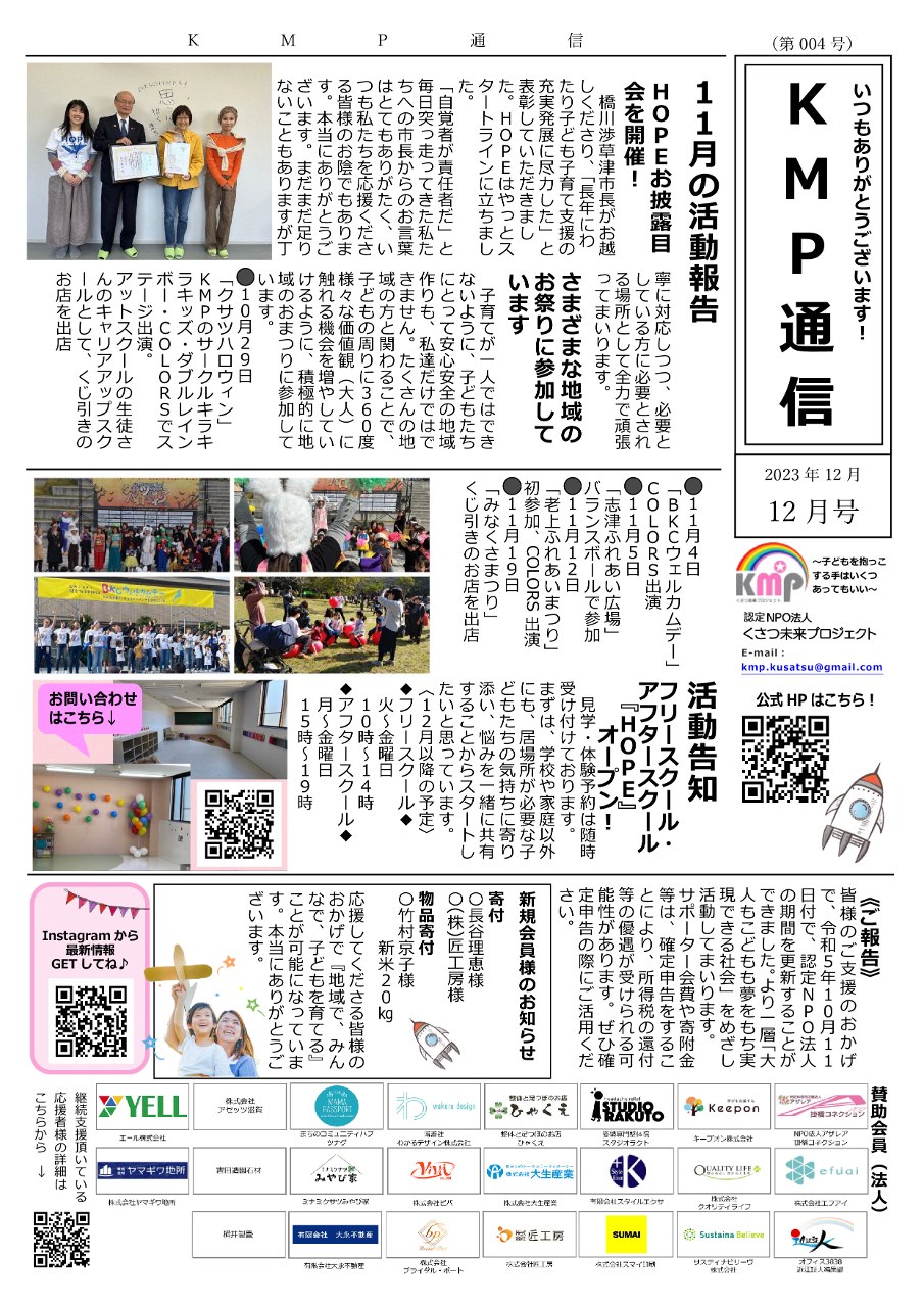 11月フリースクールHOPEのオープンに続きまして、