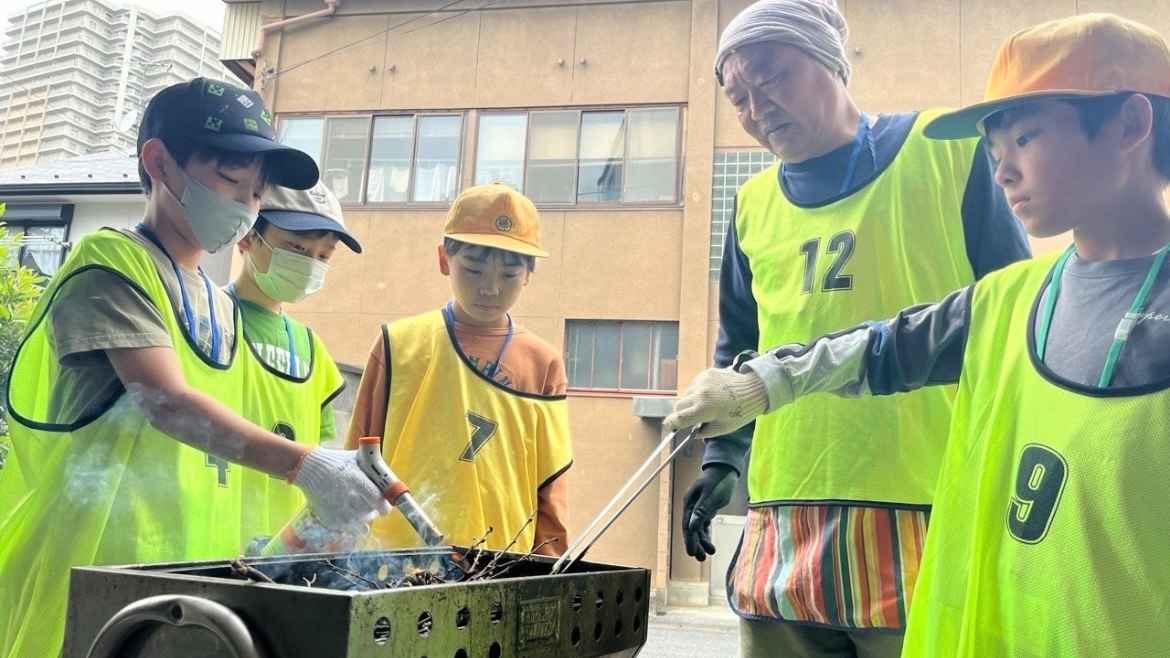 のぼさんと小汐井神社で、小枝や松ぼっくりを探してきて炭に火をつけるチーム